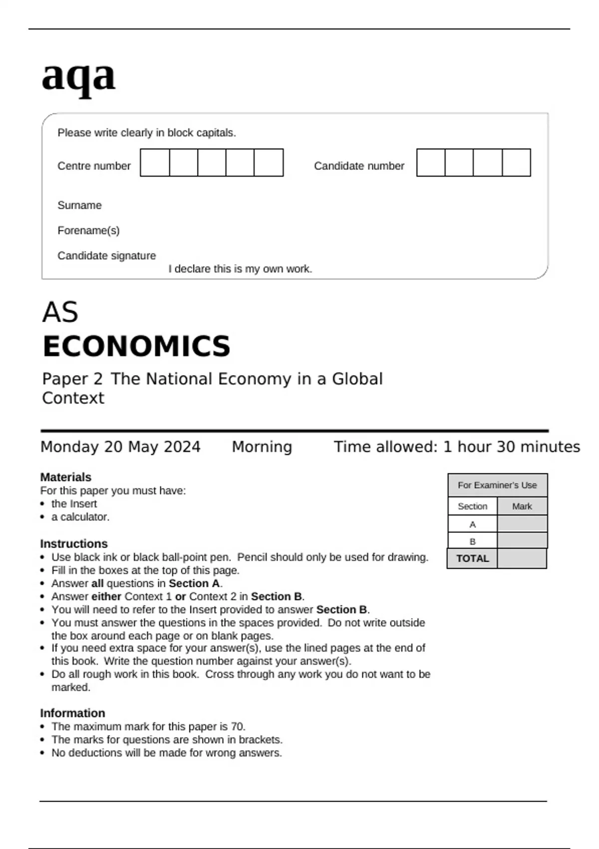 aqa AS ECONOMICS Paper 2 The National Economy in a Global Context(7135-2) May 2024 CORRECT Question Paper