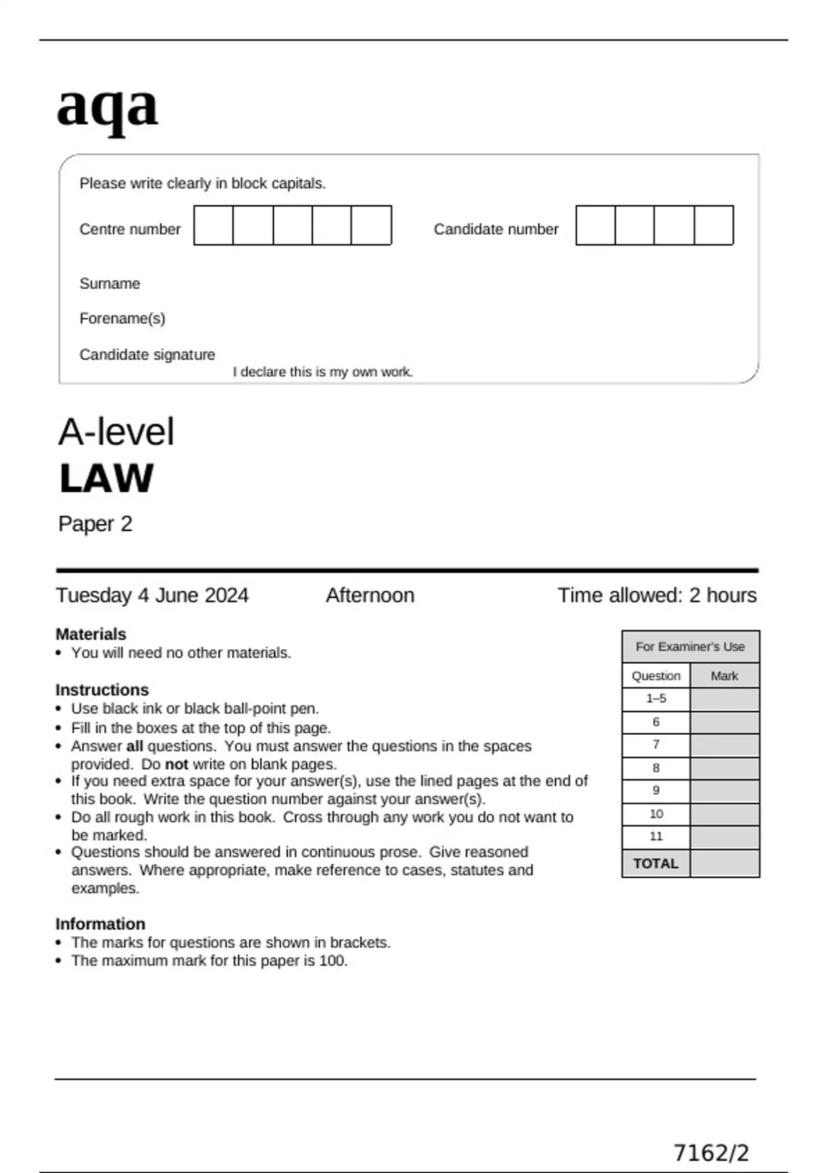 aqa A-level LAW Paper 2(7162-2) June 2024 OFFICIAL Question Paper