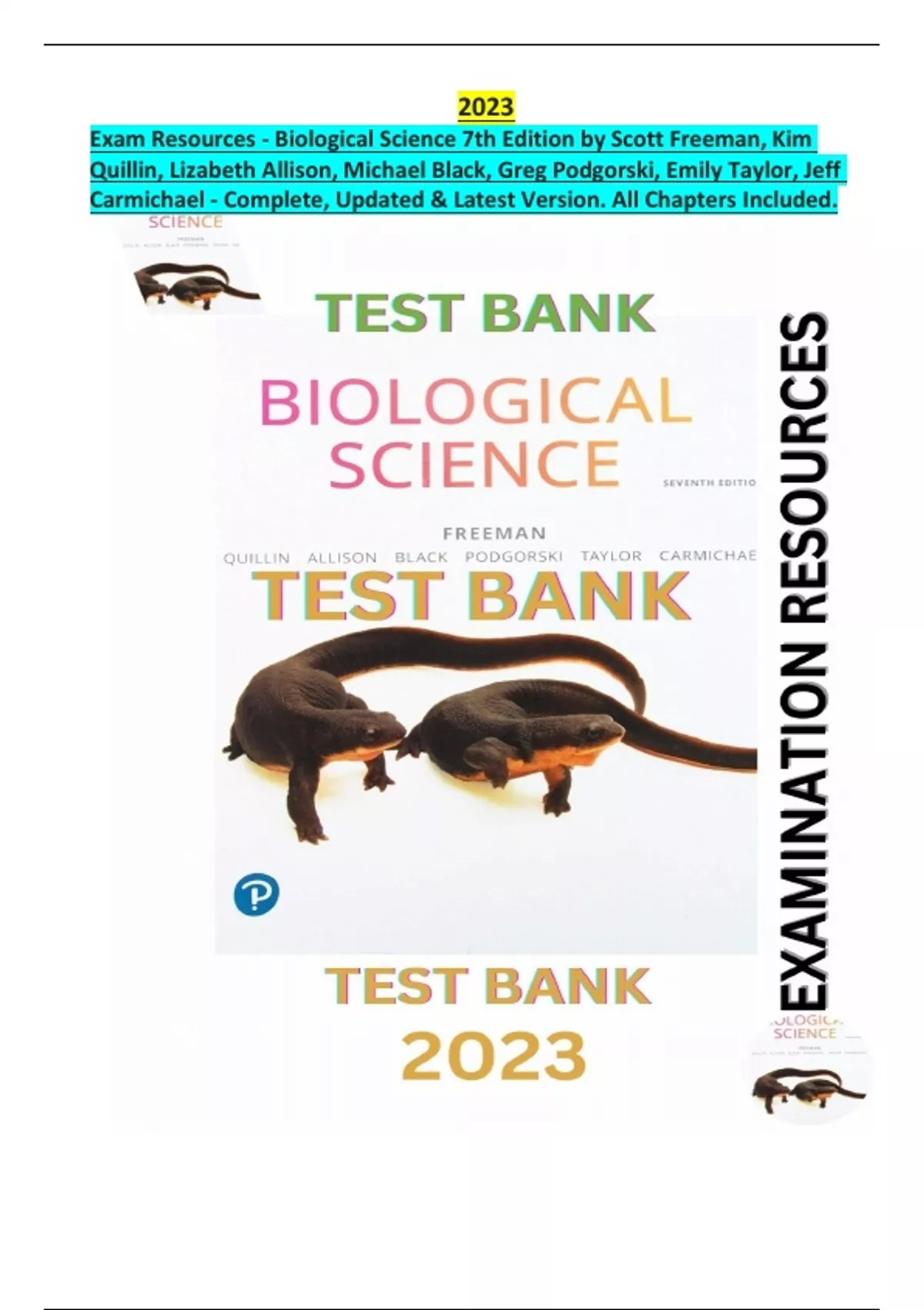Exam Resources - Biological Science 7th Edition by Scott Freeman, Kim Quillin, Lizabeth Allison, Michael Black, Greg Podgorski, Emily Taylor, Jeff Carmichael - Complete, Updated & Latest Version. All Chapters Included.