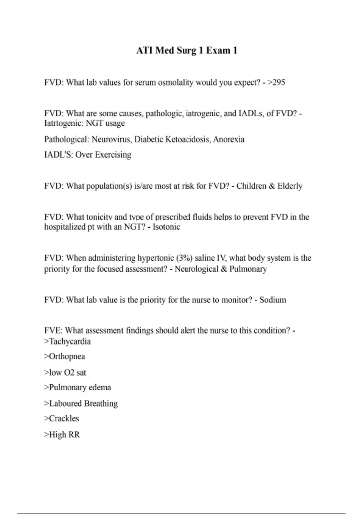 FVD: What lab values for serum osmolality would you expect? - 295 FVD: What are some causes, pathologic, iatrogenic, and IADLs, of FVD? - Iatrtogenic: NGT usage Pathological: Neurovirus, Diabetic Ketoacidosis, Anorexia IADL'S: Over Exercising FVD: What population(s) is/are most at risk for FVD? - Children & Elderly FVD: What tonicity and type of prescribed fluids helps to prevent FVD in the hospitalized pt with an NGT? - Isotonic FVD: When administering hypertonic (3%) saline IV, what body system is the priority for the focused assessment? - Neurological & Pulmonary FVD: What lab value is the priority for the nurse to monitor? - Sodium FVE: What assessment findings should alert the nurse to this condition? - Tachycardia Orthopnea low O2 sat Pulmonary edema Laboured Breathing Crackles High RR High BP Edema tachypnea FVE: When administering IV fluids, what problems would be most likely to put the patient at risk for FVE? - someone turns up rate on iv speed shock someone shoots in medication too fast angiocather against valve infiltration bc of old vein leading to induration phlebitisirritation so platelets come to help (thrombophlebitis-clot that takes shape of its container ) FVE: In what 2 ways is Dextran volume expander preferable to transfusing whole blood or packed cells? - No risk for HIV & transfusion reaction Sodium (NA): What are some economic, nutritious low sodium menu items? - Vegetables Turkey Chicken fruit Sodium (NA): What category of medication puts the patient at risk for sodium imbalance? Why? - Thiozides- diuretic so lose fluid and increase sodium Mineral Steroids-control sodium Sodium (NA): What are assessment findings for hypernatremia? - Thirst urinate alot Fever Hyperaldosteronism seizure risk headache Sodium (NA): What are assessment findings for hyponatremia? - Abdominal Cramping Muscle Spasms Stupor(altered level of con) Tachycardia edema Nausea confusion orthostatic hypertension seizure risk Sodium (NA): What is the proper procedure for measuring daily weights? - Same time (morning) Same scale Same clothes Same nurse Sodium (NA): If the patient's sodium level is normal, what other lab value is likely to be normal? Why? - Chloride & Serum Osmolarity Sodium (NA): What menu items should the nurse recommend for the patient with hyponatremia? - Ham, processed food bologna Canned Vegetables Sodium (NA): What is the priority nursing action for the patient with dilutional hyponatremia (with hypervolemia)? - Restrict Fluids Potassium (K): What common diuretic decreases the client's potassium level? - Feurosemide Potassium (K): What nursing actions should the nurse prioritize for the hypokalemic patient? - Bowel Sounds Potassium (K): What nursing action should the nurse follow when administering PO potassium supplements? - with food i.e pudding or applesauce Potassium (K): How is potassium excreted from the body? - Kidney Potassium (K): Dysfunction of what body system predisposes the patient to hyperkalemia? - Renal Failure Potassium (K): What nursing actions should be followed when providing nursing care for the client with renal disease? - No Salt substitues MonitiorECG Calcium Gluconate(reverses hyperkalemia) Sodium Styrene Sulfonate (enema that pulls potassium) K escelate Calcium (Ca): What are the functions of calcium in the body? - Activator for chemical enzymes Helps muscles & blood vessles contact & expand Calcium (Ca): What lab value is the better indicator for calcium balance? - Ionized Calcium Level Calcium (Ca): Hyperparathyroidism can be caused by what 2 conditions? - Increased Calcium Increased parathyroid hormone Calcium (Ca): What are assessment findings for hypercalcemia? - muscle weakness, headache , fatgiue, irregular hr, Calcium (Ca): What are assessment findings for hypocalcemia? - Trusors sign chivethks sign facial muscles muscle weakness Calcium (Ca): What nursing diagnoses apply to the safety of the client with hypocalcemia? - risk for injury & risk for falls Calcium (Ca): What nursing measures are indicated for the client with hypercalcemia? - Increase fluid intake (4500mLs daily) & discontinue diuretic, montior vitals for Calcium (Ca): What is a side effect of the hypercalcemic patient taking digoxin? - irregular hr, toxicity Calcium (Ca): What category of diuretic inhibits calcium excretion? - thiazide Magnesium (Mg): What is a main function of magnesium in the body? - Binds calcium to teeth enamels, energy production Magnesium (Mg): What are common causes of hypermagnesemia? - laxative abuse renal failure lithium toxicity decrease dtr