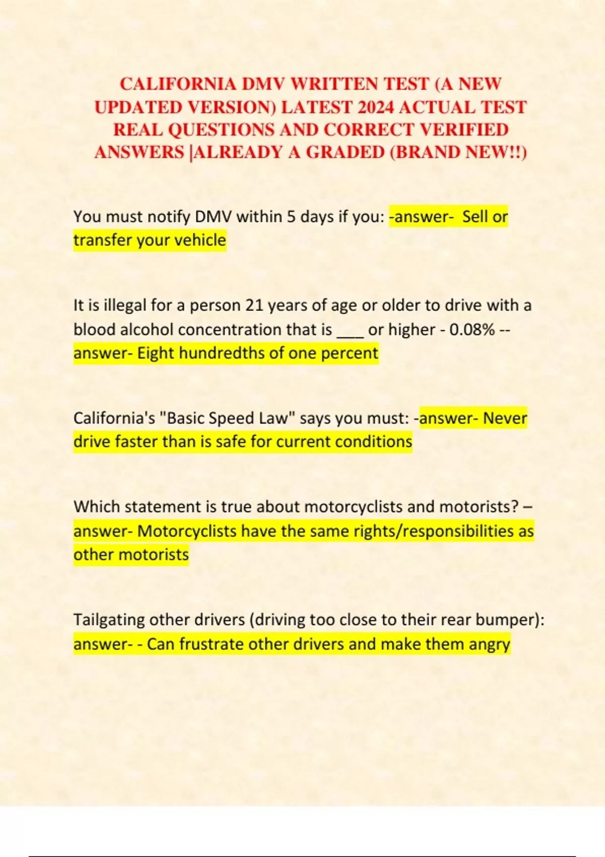 CALIFORNIA DMV WRITTEN TEST (A NEW UPDATED VERSION) LATEST 2024 ACTUAL TEST REAL QUESTIONS AND CORRECT VERIFIED ANSWERS |ALREADY A GRADED (BRAND NEW!!)