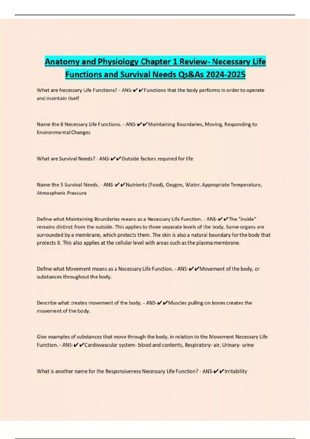 Anatomy and Physiology Chapter 1 Review- Necessary Life Functions and Survival Needs Qs&As What are Necessary Life Functions? - ANS-Functions that the body performs in order to operate and maintain itself Name the 8 Necessary Life Functions. - ANS-Maintaining Boundaries, Moving, Responding to Environmental Changes What are Survival Needs? - ANS-Outside factors required for life Name the 5 Survival Needs. - ANS-Nutrients (Food), Oxygen, Water, Appropriate Temperature, Atmospheric Pressure Define what Maintaining Boundaries means as a Necessary Life Function. - ANS-The "inside" remains distinct from the outside. This applies to three separate levels of the body. Some organs are surrounded by a membrane, which protects them. The skin is also a natural boundary for the body that protects it. This also applies at the cellular level with areas such as the plasma membrane. Define what Movement means as a Necessary Life Function. - ANS-Movement of the body, or substances throughout the body. Describe what creates movement of the body. - ANS-Muscles pulling on bones creates the movement of the body. Give examples of substances that move through the body, in relation to the Movement Necessary Life Function. - ANS-Cardiovascular system- blood and contents, Respiratory- air, Urinary- urine What is another name for the Responsiveness Necessary Life Function? - ANS-