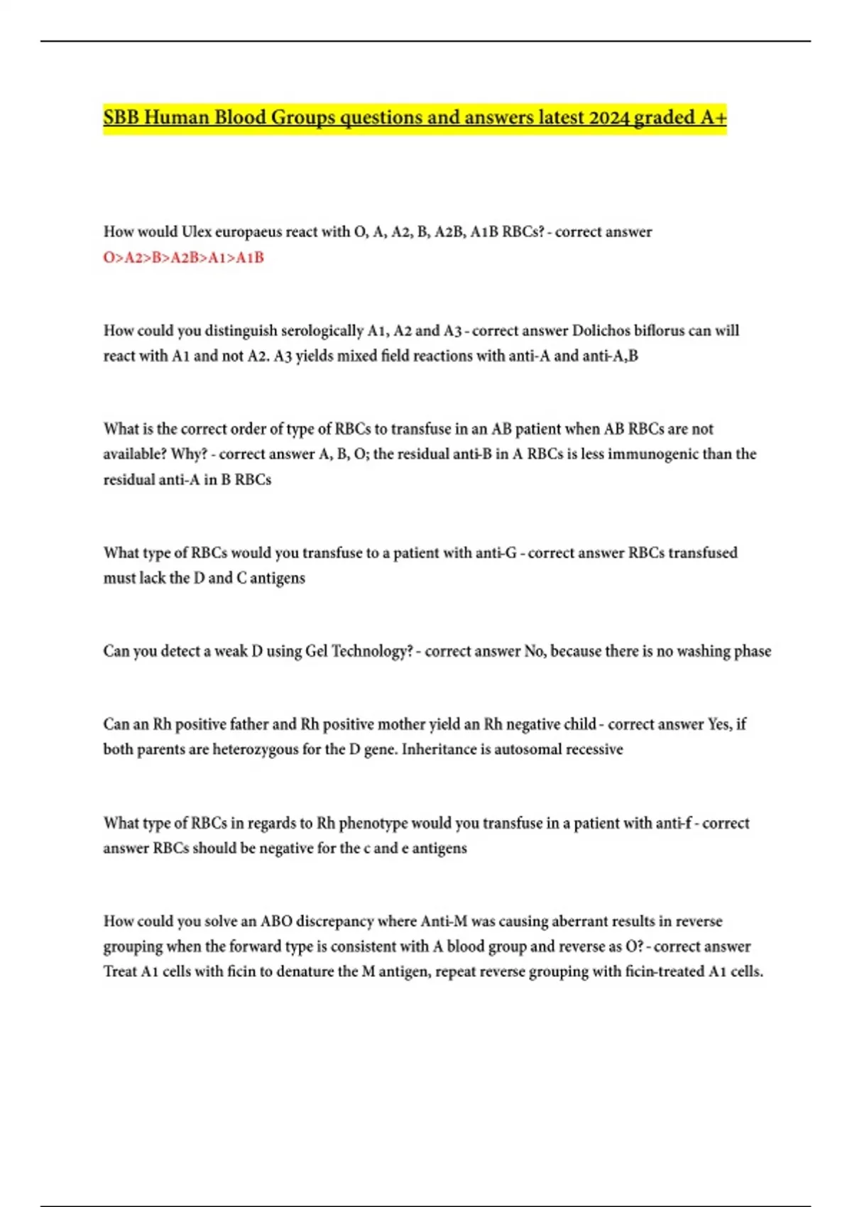 SBB Human Blood Groups (Questions with 100% accurate answers) updated 2024/2025