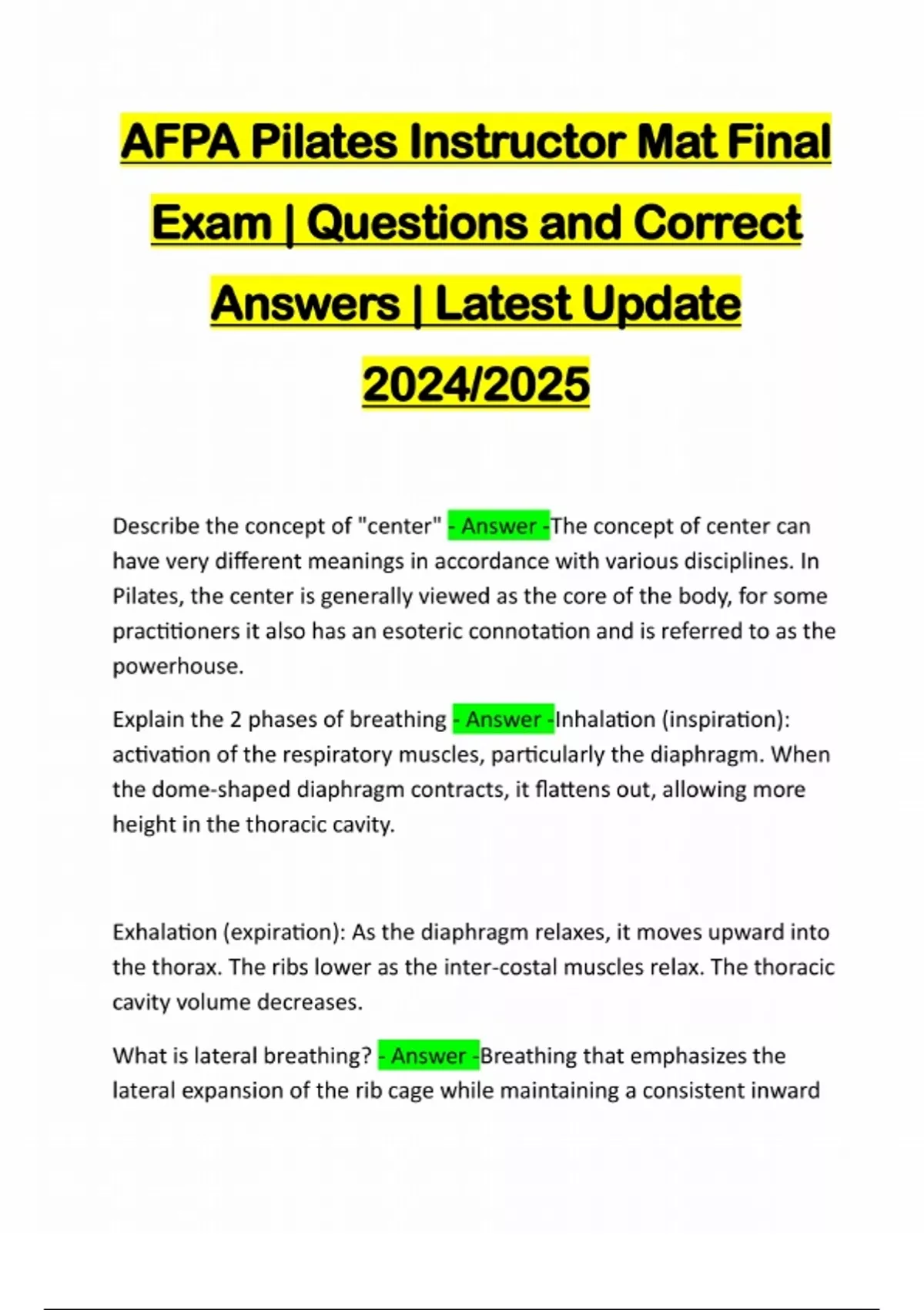 AFPA Pilates Instructor Mat Final Exam | Questions and Correct Answers | Latest Update 2024/2025 Describe the concept of "center" - Answer -The concept of center can have very different meanings in accordance with various disciplines. In Pilates, the center is generally viewed as the core of the body, for some practitioners it also has an esoteric connotation and is referred to as the powerhouse. Explain the 2 phases of breathing - Answer -Inhalation (inspiration): activation of the respiratory muscles, particularly the diaphragm. When the dome-shaped diaphragm contracts, it flattens out, allowing more height in the thoracic cavity. Exhalation (expiration): As the diaphragm relaxes, it moves upward into the thorax. The ribs lower as the inter-costal muscles relax. The thoracic cavity volume decreases. What is lateral breathing? - Answer -Breathing that emphasizes the lateral expansion of the rib cage while maintaining a consistent inwardpull of the deep abdominal muscles during both inhalation and exhalation. Name and define the primary movements of the spine - Answer -Spinal Flexion: refers to the forward bending of