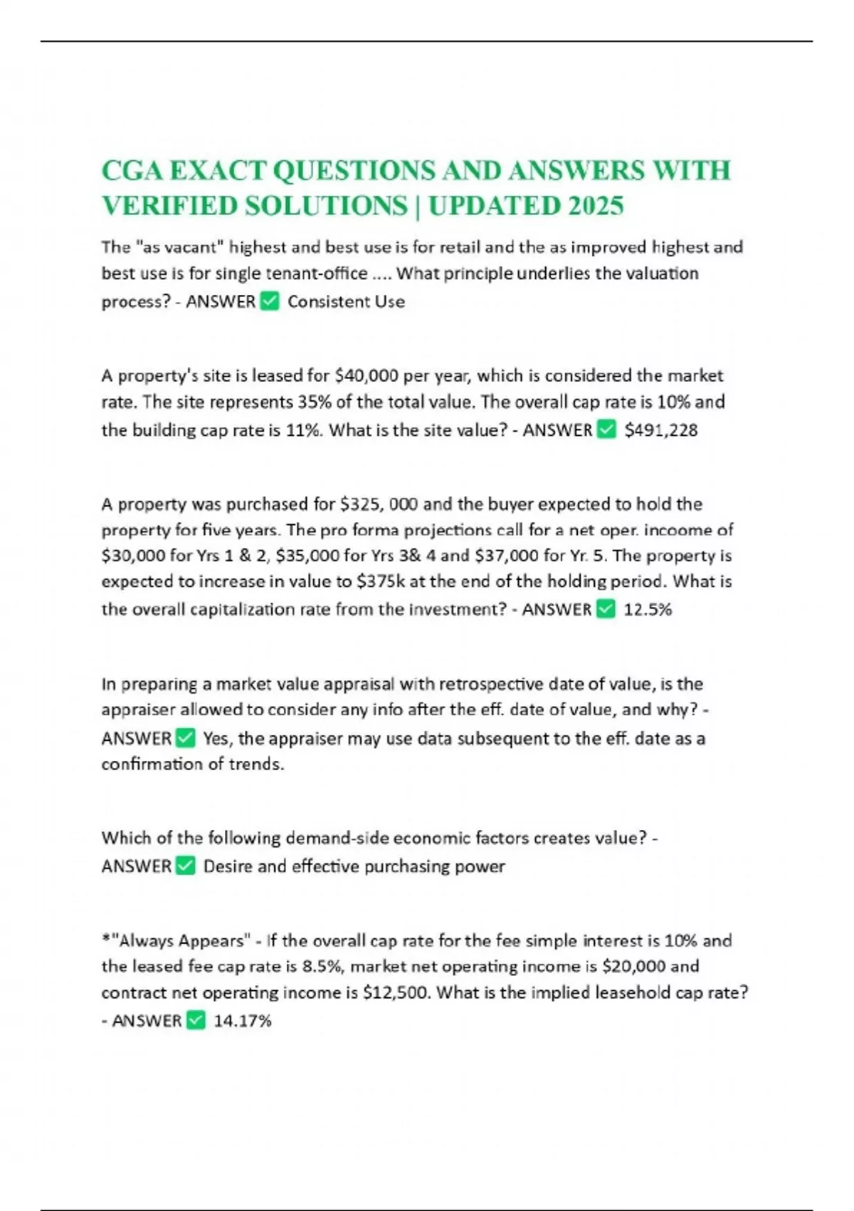 CGA EXACT QUESTIONS AND ANSWERS WITH VERIFIED SOLUTIONS | UPDATED 2025 The "as vacant" highest and best use is for retail and the as improved highest and best use is for single tenant-office .... What principle underlies the valuation process? Consistent Use A property's site is leased for $40,000 per year, which is considered the market rate. The site represents 35% of the total value. The overall cap rate is 10% and the building cap rate is 11%. What is the site value? $491,228 A property was purchased for $325, 000 and the buyer expected to hold the property for five years. The pro forma projections call for a net oper. incoome of $30,000 for Yrs 1 & 2, $35,000 for Yrs 3& 4 and $37,000 for Yr. 5. The property is expected to increase in value to $375k at the end of the holding period. What is the overall capitalization rate from the investment? 12.5% In preparing a market value appraisal with retrospective date of value, is the appraiser allowed to consider any info after the eff. date of value, and why? Yes, the appraiser may use data subsequent to the eff. date as a confirmation of trends. Which of the following demand-side economic factors creates value? Desire and effective purchasing power *"Always Appears" - If the overall cap rate for the fee simple interest is 10% and the leased fee cap rate is 8.5%, market net operating income is $20,000 and contract net operating income is $12,500. What is the implied leasehold cap rate? 14.17%