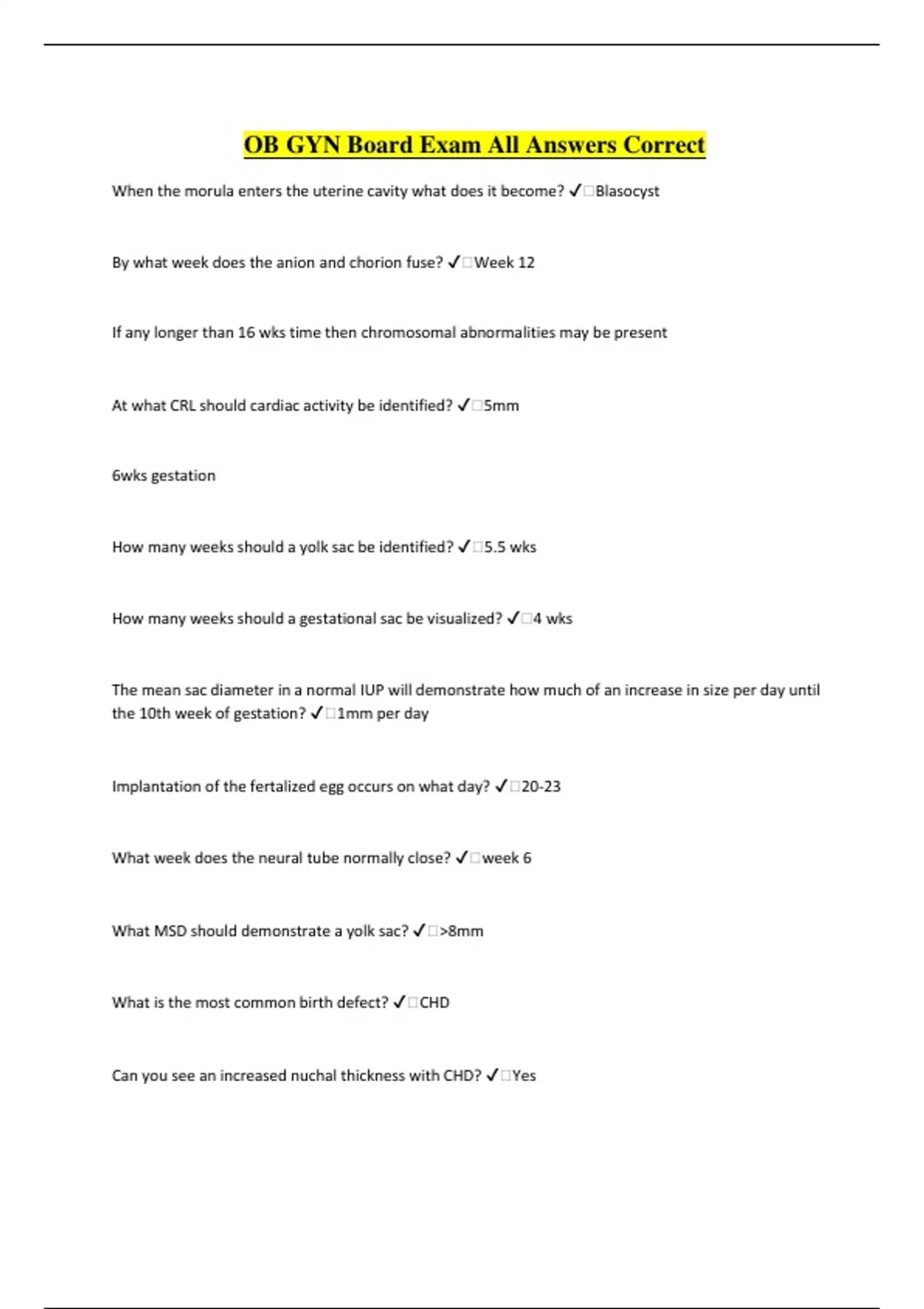 OB GYN Board Exam All Answers Correct When the morula enters the uterine cavity what does it become? ️Blasocyst By what week does the anion and chorion fuse? ️Week 12 If any longer than 16 wks time then chromosomal abnormalities may be present At what CRL should cardiac activity be identified? ️5mm 6wks gestation How many weeks should a yolk sac be identified? ️5.5 wks How many weeks should a gestational sac be visualized? ️4 wks The mean sac diameter in a normal IUP will demonstrate how much of an increase in size per day until the 10th week of gestation? ️1mm per day Implantation of the fertalized egg occurs on what day? ️20-23 What week does the neural tube normally close? ️week 6 What MSD should demonstrate a yolk sac? ️>8mm What is the most common birth defect? ️CHD Can you see an increased nuchal thickness with CHD? ️Yes What are the 4 types of ASD? ️1. Primun 2. Secundum 3. Venosus Which ASD is closest to the valves? ️Primun Is heterozygous achrondoplasia lethal? ️No No pulmonary hypoplasia Is homozygous achondroplasia lethal? ️Yes Shortened ribs and pulmonary hypoplasia What is prune belly also known as? ️Eagle Barrett Syndro