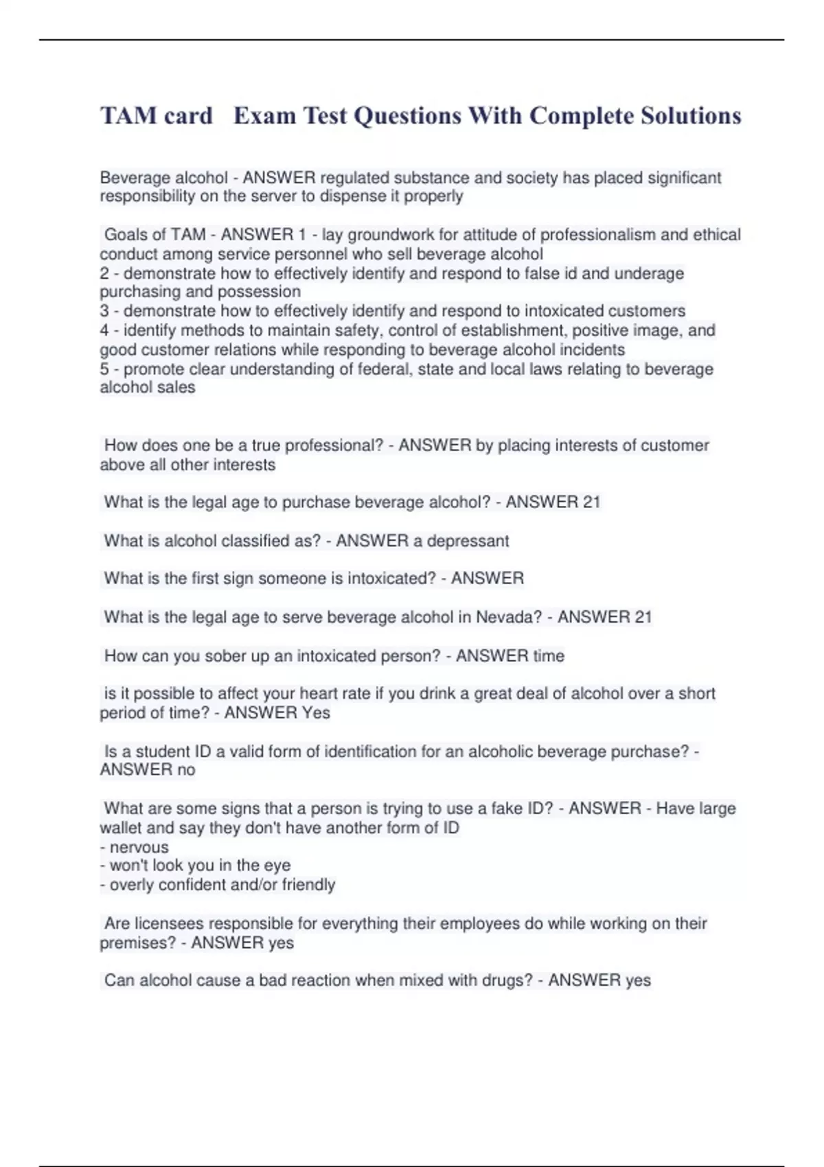 TAM card Exam Test Questions With Complete Solutions Beverage alcohol - ANSWER regulated substance and society has placed significant responsibility on the server to dispense it properly Goals of TAM - ANSWER 1 - lay groundwork for attitude of professionalism and ethical conduct among service personnel who sell beverage alcohol 2 - demonstrate how to effectively identify and respond to false id and underage purchasing and possession 3 - demonstrate how to effectively identify and respond to intoxicated customers 4 - identify methods to maintain safety, control of establishment, positive image, and good customer relations while responding to beverage alcohol incidents 5 - promote clear understanding of federal, state and local laws relating to beverage alcohol sales How does one be a true professional? - ANSWER by placing interests of customer above all other interests What is the legal age to purchase beverage alcohol? - ANSWER 21 What is alcohol classified as? - ANSWER a depressant What is the first sign someone is intoxicated? - ANSWER What is the legal age to serve beverage alcohol in Nevada? - ANSWER 21 How can you sober up an intoxicated person? - ANSWER time is it possible to affect your heart rate if you drink a great deal of alcohol over a short period of time? - ANSWER Yes Is a student ID a valid form of identification for an alcoholic beverage purchase? - ANSWER no What are some signs that a person is trying to use a fake ID? - ANSWER - Have large wallet and say they don't have another form of ID - nervous - won't look you in the eye - overly confident and/or friendly Are licensees responsible for everything their employees do while working on their premises? - ANSWER yes Can alcohol cause a bad reaction when mixed with drugs? - ANSWER yes T or F: An average mixed drink contains nearly twice as much alcohol as a 12-ounce beer. - ANSWER False Purpose of TAM - ANSWER educate and train business owners and their employees to create safe and comfortable environments. By implements responsible hospitality practices, a business can reduce liability risks and enhance the potential for increased profitability offers a variety of problem solving techniques as they relate to the operation of businesses selling beverage alcohol for consumption on and off licensed premises to meet goals T or F: An employee of a licensed establishment may be subject to consequences for serving an intoxicated person. - ANSWER True T or F: Everyone eliminates alcohol from the body at about the same rate. - ANSWER True T or F: You can legally refuse to sell alcoholic beverages to a customer eve if they have valid id - ANSWER True What are some ways to stop people from becoming intoxicated when drinking beverage alcohol? - ANSWER - Slow down service - Encourage them to eat food - Suggest non-alcoholic alternatives T or F: Women tend to become intoxicated faster than men - ANSWER True T or F: A person's mood will affect how rapidly they become intoxicated from beverage alcohol - ANSWER True What are some good ways to avoid physical violence or customer disturbances in your establishment? - ANSWER - Don't offer specials that might encourage excessive alcohol consumption - pay attention to everything going on - don't serve customers to the point of intoxication - eavesdrop on conversations Verification of age is whose responsibility? - ANSWER The server/seller What do you see as the biggest concern facing sellers of beverage alcohol? - ANSWER - Sales to underage persons - Sales to intoxicated persons - Disturbances Are laws governing alcohol sales in restaurants the same as those for liquor stores? - ANSWER No Are the laws for distilled spirits the same as those for other alcohols such as wine or beer? - ANSWER No Which aspects of the alcohol industry are regulated by the federal government? - ANSWER aspects of interstate commerce involving the beverage alcohol industry Which aspects of the alcohol industry are regulated by state and local governments? - ANSWER laws pertaining to the sale, service and consumption of beverage alcohol many local communities have specific liquor licensing requirements that extend beyond those set in state laws DRAM Shop Liability - ANSWER legislation that requires servers to exercise a "duty of care" to not sell or serve beverage alcohol to underage and intoxicated persons. "Duty of care" coexists with the responsibility on the part of the patron not to drive while intoxicated or attempt to purchase or consume beverage alcohol when underage or intoxicated What is the difference between DRAM shot liability and general liability? - ANSWER DRAM provides a method of compensating third-party innocent victims and their families for accidents caused by intoxicated persons and minors who have consumed alcohol What are the responsibilities of sellers and servers? - ANSWER - use independent judgement to interpret and enforce the law (don't serve underage or intoxicated people) - modify behavior of patrons - help patrons make responsible decisions What amendment prohibited alcohol and what amendment repealed that? - ANSWER 18, 21 What is the TTS and what is its purpose? - ANSWER The Alcohol and Tobacco Tax and Trade Bureau is the federal agency primarily involved in the regulation of beverage alcohol and tobacco. Its involvement is generally limited to alcohol production and distribution and taxation of alcohol and tobacco. What is the legal blood alcohol level for driving an automobile? - ANSWER 0.08% How does the federal government mandate the legal blood alcohol level? - ANSWER by withholding highway funds from those states that refuse to comply (but all states currently comply) Do alcohol laws and regulations vary from state to state? - ANSWER Yes
