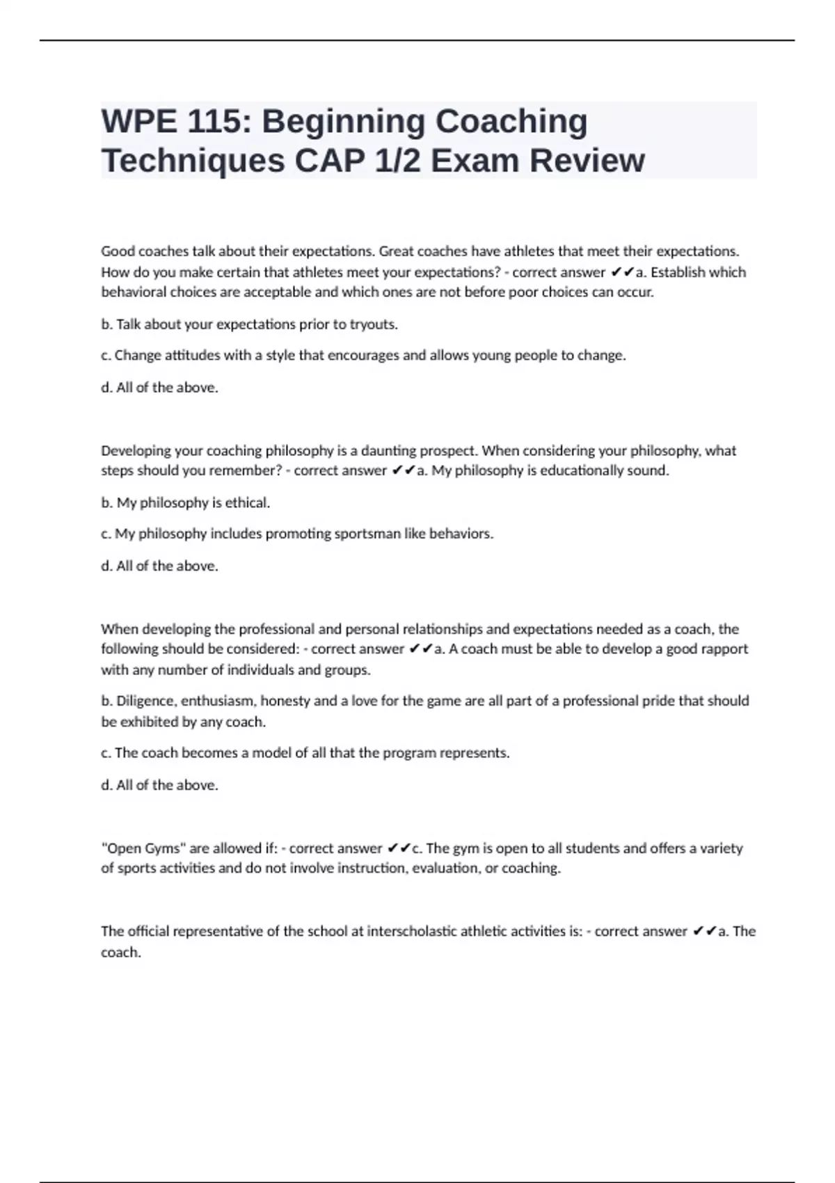 WPE 115: Beginning Coaching Techniques CAP 1/2 Exam Review updated already passed