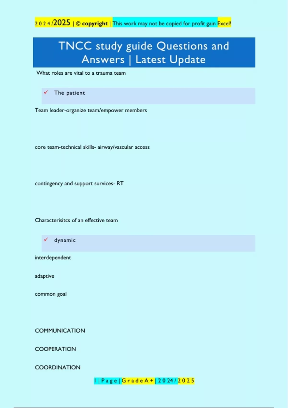 What roles are vital to a trauma team The patient Team leader-organize team/empower members core team-technical skills- airway/vascular access contingency and support survices- RT Characterisitcs of an effective team dynamic interdependent adaptive common goal COMMUNICATION COOPERATION COORDINATION 2 0 2 4 /2025 | © copyright | This work may not be copied for profit gain Excel! 1 | P a g