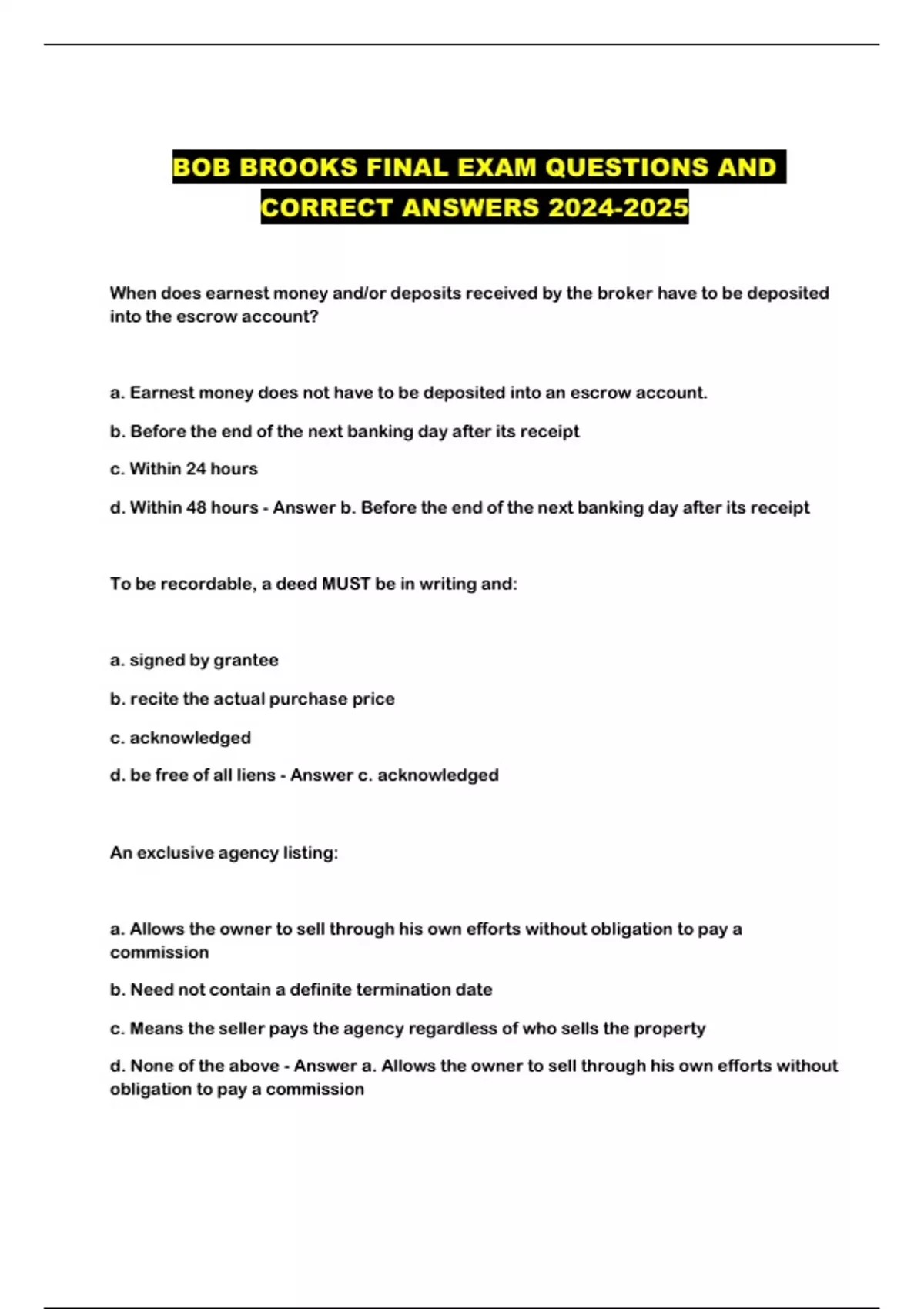 BOB BROOKS FINAL EXAM QUESTIONS AND