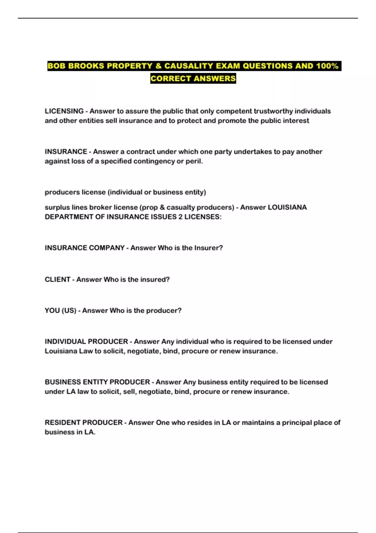 BOB BROOKS PROPERTY & CAUSALITY EXAM QUESTIONS AND 100%