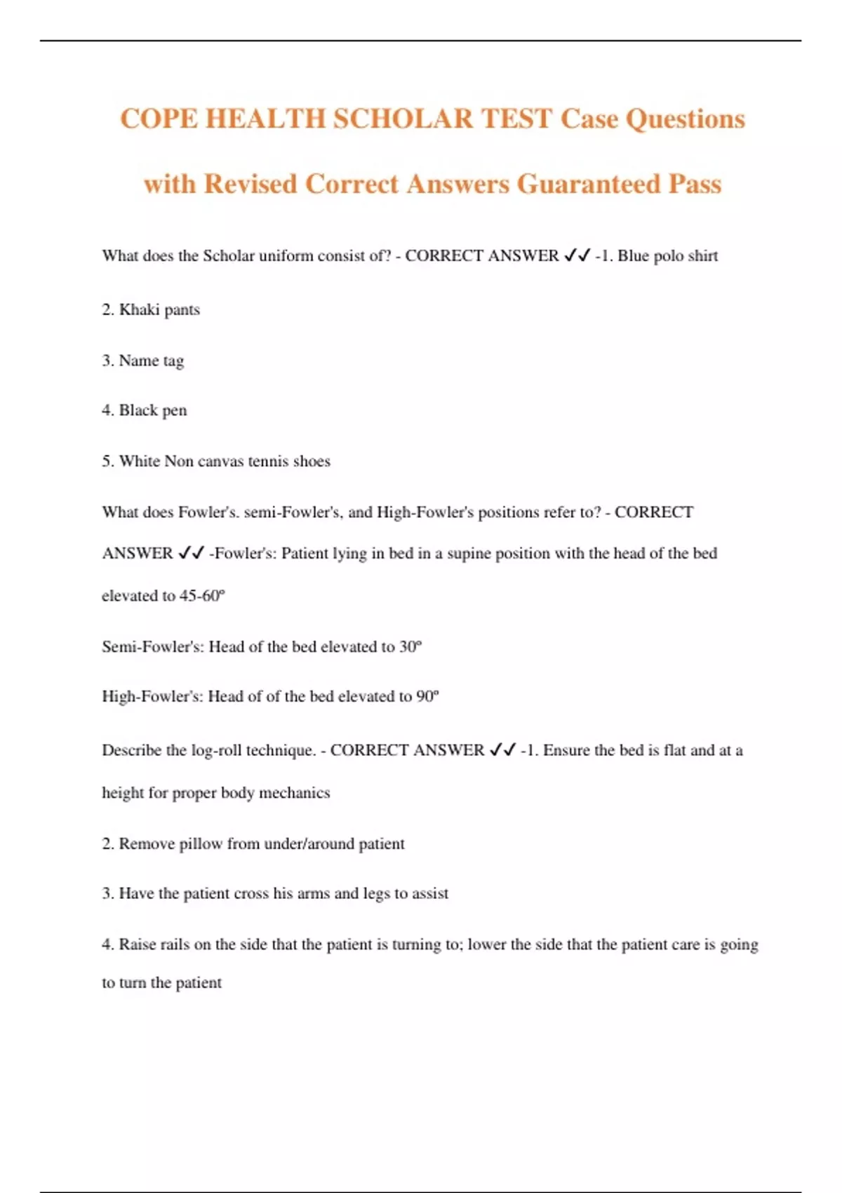 What does the Scholar uniform consist of? - CORRECT ANSWER ️️ -1. Blue polo shirt 2. Khaki pants 3. Name tag 4. Black pen 5. White Non canvas tennis shoes What does Fowler's. semi-Fowler's, and High-Fowler's positions refer to? - CORRECT ANSWER ️️ -Fowler's: Patient lying in bed in a supine position with the head of the bed elevated to 45-60º Semi-Fowler's: Head of the bed elevated to 30º High-Fowler's: Head of of the bed elevated to 90º Describe the log-roll technique. - CORRECT ANSWER ️️ -1. Ensure the bed is flat and at a height for proper body mechanics 2. Remove pillow from under/around patient 3. Have the patient cross his arms and legs to assist 4. Raise rails on the side that the patient is turning to; lower the side that the patient care is going to turn the patient 5. Put one hand under scapula and other under the lower back 6. Ask patient to grab onto the rail on the other. 7. On a count of three, roll the patient and ask ur partner to hold onto the patient while he/she is one his/her side What is PHI and what are three types? - CORRECT ANSWER ️️ -PHI: Protected health information