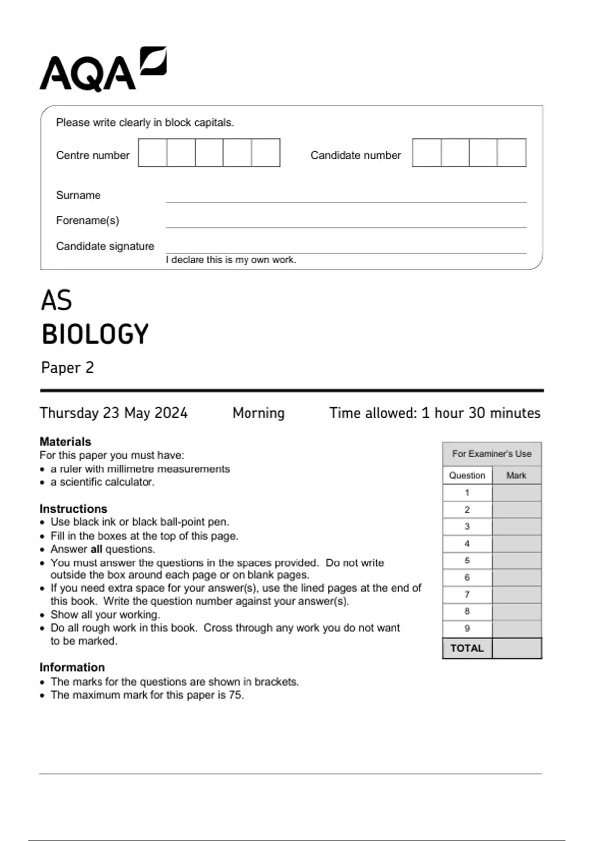 • The maximum mark for this paper is 75.