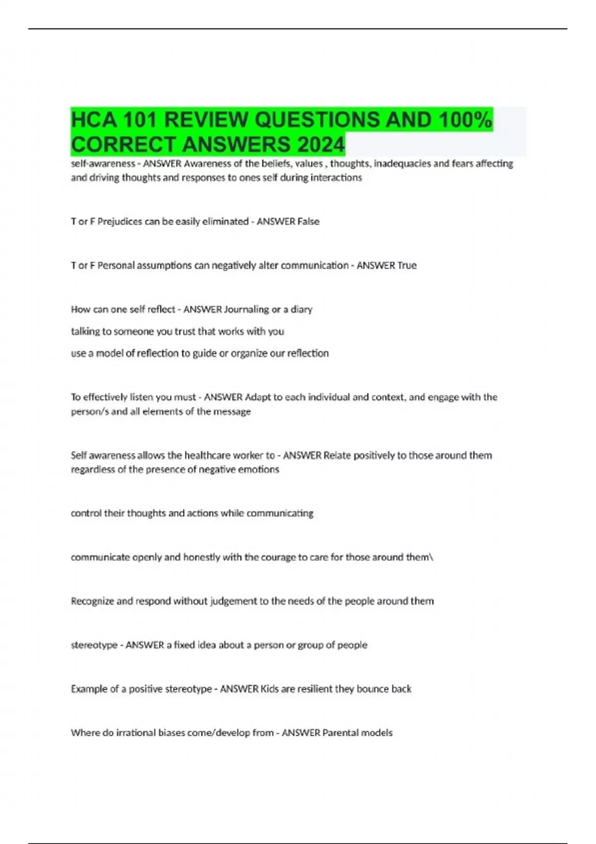 HCA 101 REVIEW QUESTIONS AND 100% CORRECT ANSWERS 2024