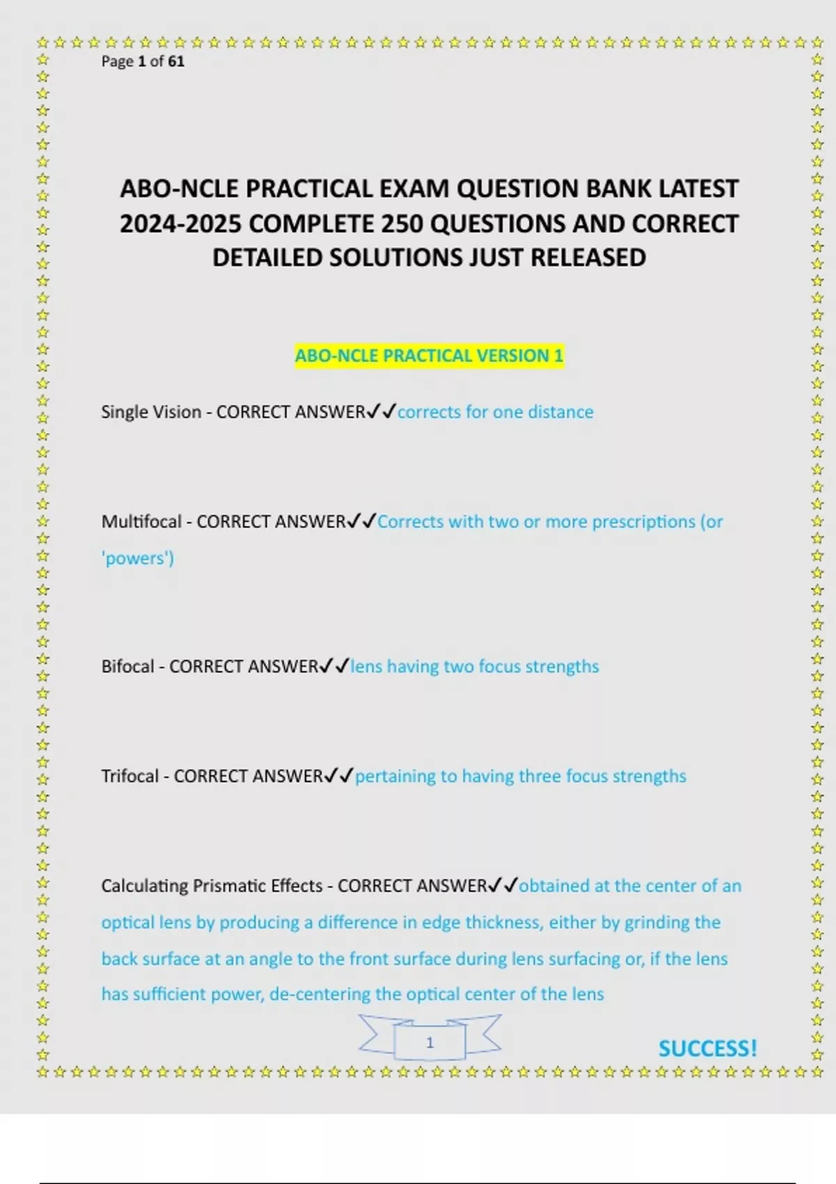 Single Vision - CORRECT ANSWER✔✔corrects for one distance