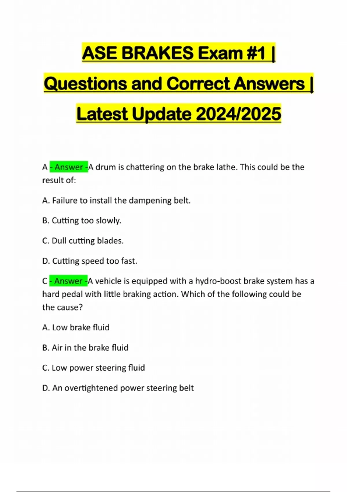 ASE BRAKES Exam #1 | Questions and Correct Answers | Latest Update 2024/2025 A - Answer -A drum is chattering on the brake lathe. This could be the result of: A. Failure to install the dampening belt. B. Cutting too slowly. C. Dull cutting blades. D. Cutting speed too fast. C - Answer -A vehicle is equipped with a hydro-boost brake system has a hard pedal with little braking action. Which of the following could be the cause? A. Low brake fluid B. Air in the brake fluid C. Low power steering fluid D. An overtightened power steering beltD - Answer -Which of the following could cause excessive noise while braking? A. Worn wheel cylinders B. Worn caliper pistons C. Seized caliper slid