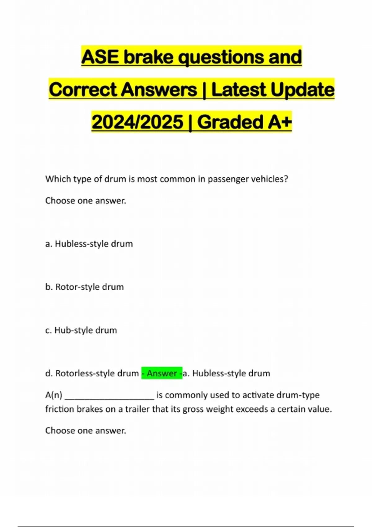 ASE brake questions and Correct Answers | Latest Update 2024/2025 | Graded A+ Which type of drum is most common in passenger vehicles? Choose one answer. a. Hubless-style drum b. Rotor-style drum c. Hub-style drum d. Rotorless-style drum - Answer -a. Hubless-style drum A(n) __________________ is commonly used to activate drum-type friction brakes on a trailer that its gross weight exceeds a certain value. Choose one answer.a. surge brake b. electric braking system c. Both A and B