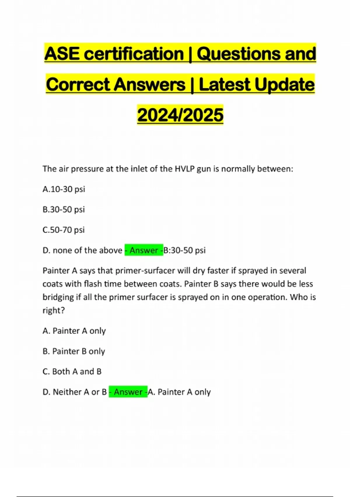 ASE certification | Questions and Correct Answers | Latest Update 2024/2025 The air pressure at the inlet of the HVLP gun is normally between: A.10-30 psi B.30-50 psi C.50-70 psi D. none of the above - Answer -B:30-50 psi Painter A says that primer-surfacer will dry faster if sprayed in several coats with flash time between coats. Painter B says there would be less bridging if all the primer surfacer is sprayed on in one operation. Who is right? A. Painter A only B. Painter B only C. Both A and B D. Neither A or B - Answer -A. Painter A onlyThe door shown above has a large number of paint chips. The paint is the original finish. Painter A says the chips should be filled with an application of polyester glazing putty before refinishing. Painter B says that the chips should be sanded out before refinishing. Who is right? A. Painter A only B. Painter B only