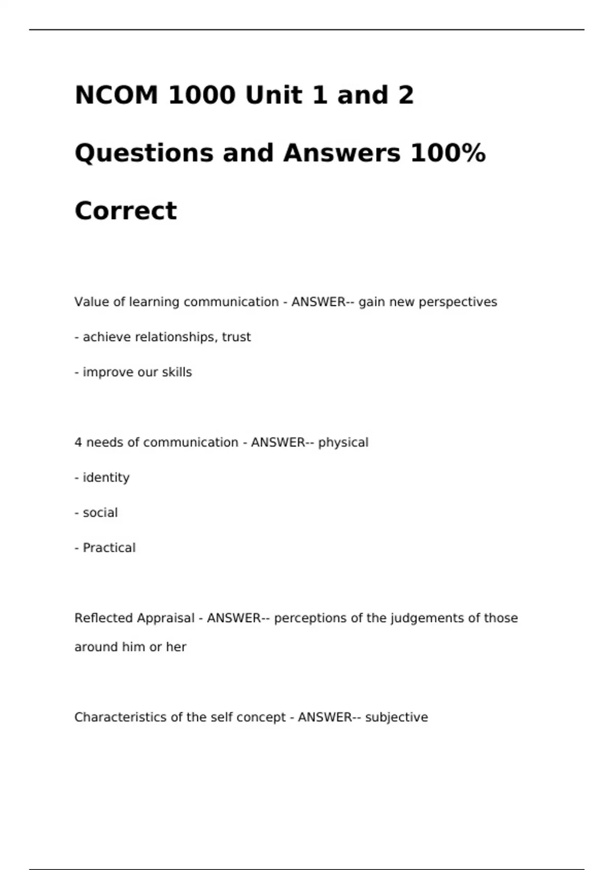 NCOM 1000 Unit 1 and 2 Questions and Answers 100% CorrectNCOM 1000 Unit 1 and 2 Questions and Answers 100% CorrectNCOM 1000 Unit 1 and 2 Questions and Answers 100% CorrectNCOM 1000 Unit 1 and 2 Questions and Answers 100% Correct Value of learning communication - ANSWER-- gain new perspectives - achieve relationships, trust - improve our skills 4 needs of communication - ANSWER-- physical - identity - social