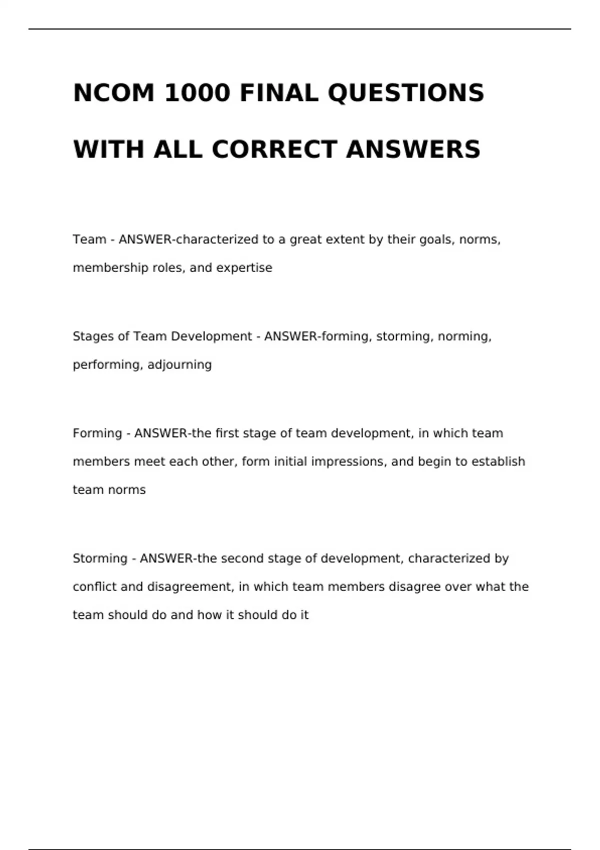 NCOM 1000 FINAL QUESTIONS WITH ALL CORRECT ANSWERSNCOM 1000 FINAL QUESTIONS WITH ALL CORRECT ANSWERSNCOM 1000 FINAL QUESTIONS WITH ALL CORRECT ANSWERSNCOM 1000 FINAL QUESTIONS WITH ALL CORRECT ANSWERS Team - ANSWER-characterized to a great extent by their goals, norms, membership roles, and expertise Stages of Team Development - ANSWER-forming, storming, norming, performing, adjourning Forming - ANSWER-the first stage of team development, in which team members meet each other, form initial impressions, and begin to establish team norms