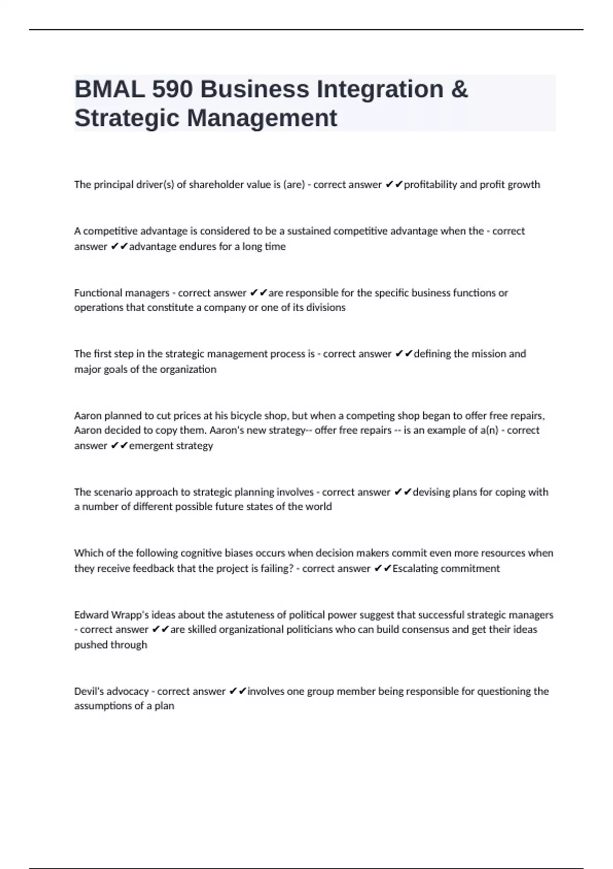 The scenario approach to strategic planning involves - correct answer ✔✔devising plans for coping with