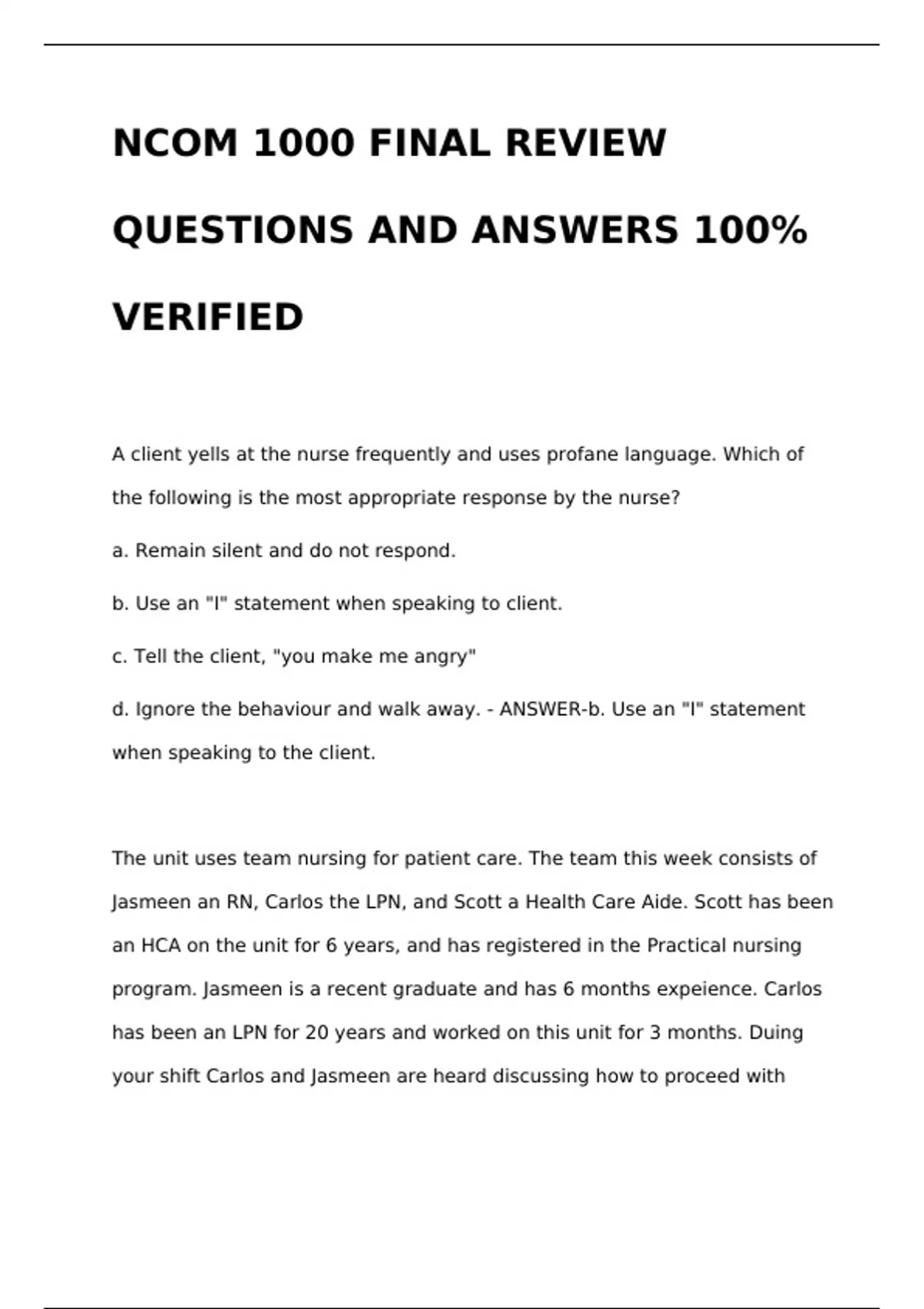 NCOM 1000 FINAL REVIEW QUESTIONS AND ANSWERS 100% VERIFIEDNCOM 1000 FINAL REVIEW QUESTIONS AND ANSWERS 100% VERIFIEDNCOM 1000 FINAL REVIEW QUESTIONS AND ANSWERS 100% VERIFIEDNCOM 1000 FINAL REVIEW QUESTIONS AND ANSWERS 100% VERIFIED A client yells at the nurse frequently and uses profane language. Which of the following is the most appropriate response by the nurse? a. Remain silent and do not respond. b. Use an "I" statement when speaking to client. c. Tell the client, "you make me angry" d. Ignore the behaviour and walk away. - ANSWER-b. Use an "I" statement when speaking to the client. The unit uses team nursing for patient care. The team this week consists of Jasmeen an RN, Carlos the LPN, and Scott a Health Care Aide. Scott has been an HCA on the unit for 6 years, and has registered in the Practical nursing