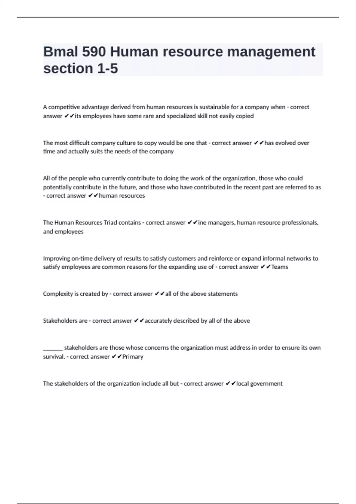 Bmal 590 Human resource management section 1-5 questions with complete solutions