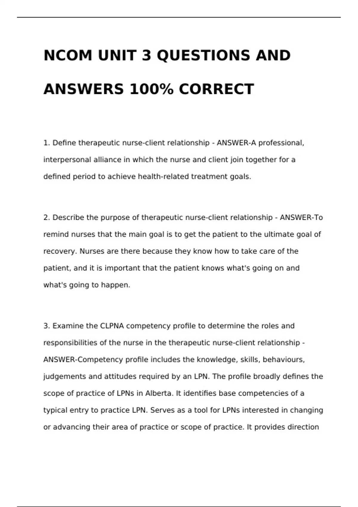 NCOM UNIT 3 QUESTIONS AND ANSWERS 100% CORRECTNCOM UNIT 3 QUESTIONS AND ANSWERS 100% CORRECTNCOM UNIT 3 QUESTIONS AND ANSWERS 100% CORRECTNCOM UNIT 3 QUESTIONS AND ANSWERS 100% CORRECTNCOM UNIT 3 QUESTIONS AND ANSWERS 100% CORRECT 1. Define therapeutic nurse-client relationship - ANSWER-A professional, interpersonal alliance in which the nurse and client join together for a defined period to achieve health-related treatment goals. 2. Describe the purpose of therapeutic nurse-client relationship - ANSWER-To remind nurses that the main goal is to get the patient to the ultimate goal of recovery. Nurses are there because they know how to take care of the patient,