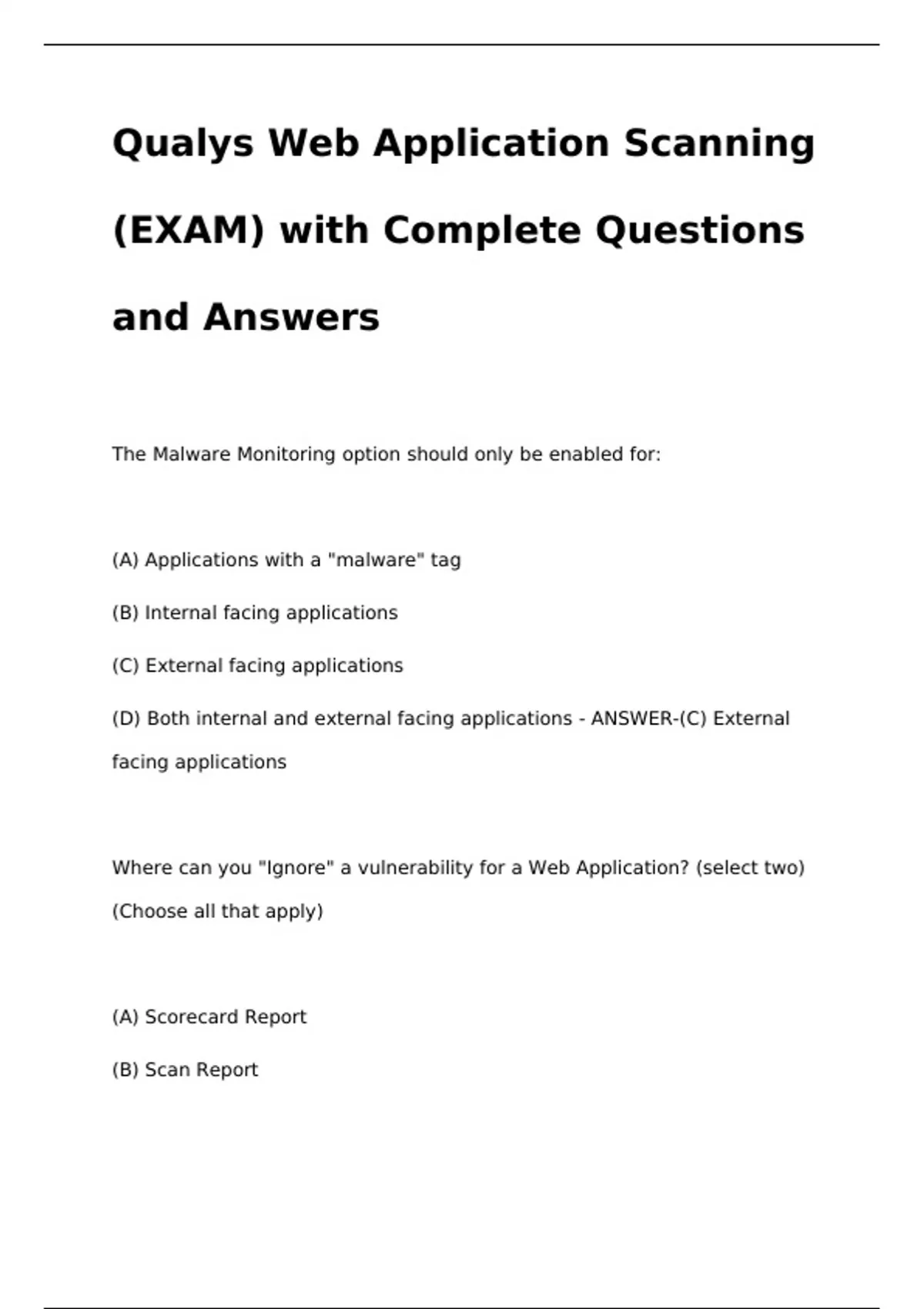 Qualys Web Application Scanning (EXAM) with Complete Questions and AnswersQualys Web Application Scanning (EXAM) with Complete Questions and AnswersQualys Web Application Scanning (EXAM) with Complete Questions and AnswersQualys Web Application Scanning (EXAM) with Complete Questions and Answers The Malware Monitoring option should only be enabled for: (A) Applications with a "malware" tag (B) Internal facing applications (C) External facing applications (D) Both internal and external facing applications - ANSWER-(C) External facing applications Where can you "Ignore" a vulnerability for a Web Application? (select two) (Choose all that apply)