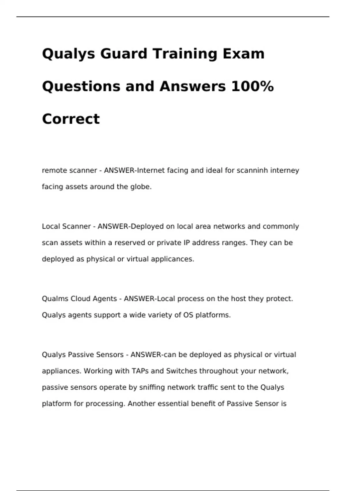 Qualys Guard Training Exam QuestiQualys Guard Training Exam Questions and Answers 100% CorrectQualys Guard Training Exam Questions and Answers 100% CorrectQualys Guard Training Exam Questions and Answers 100% CorrectQualys Guard Training Exam Questions and Answers 100% Correctons and Answers 100% Correct remote scanner - ANSWER-Internet facing and ideal for scanninh interney facing assets around the globe. Local Scanner - ANSWER-Deployed on local area networks and commonly scan assets within a reserved or private IP address ranges. They can be deployed as physical or virtual applicances.