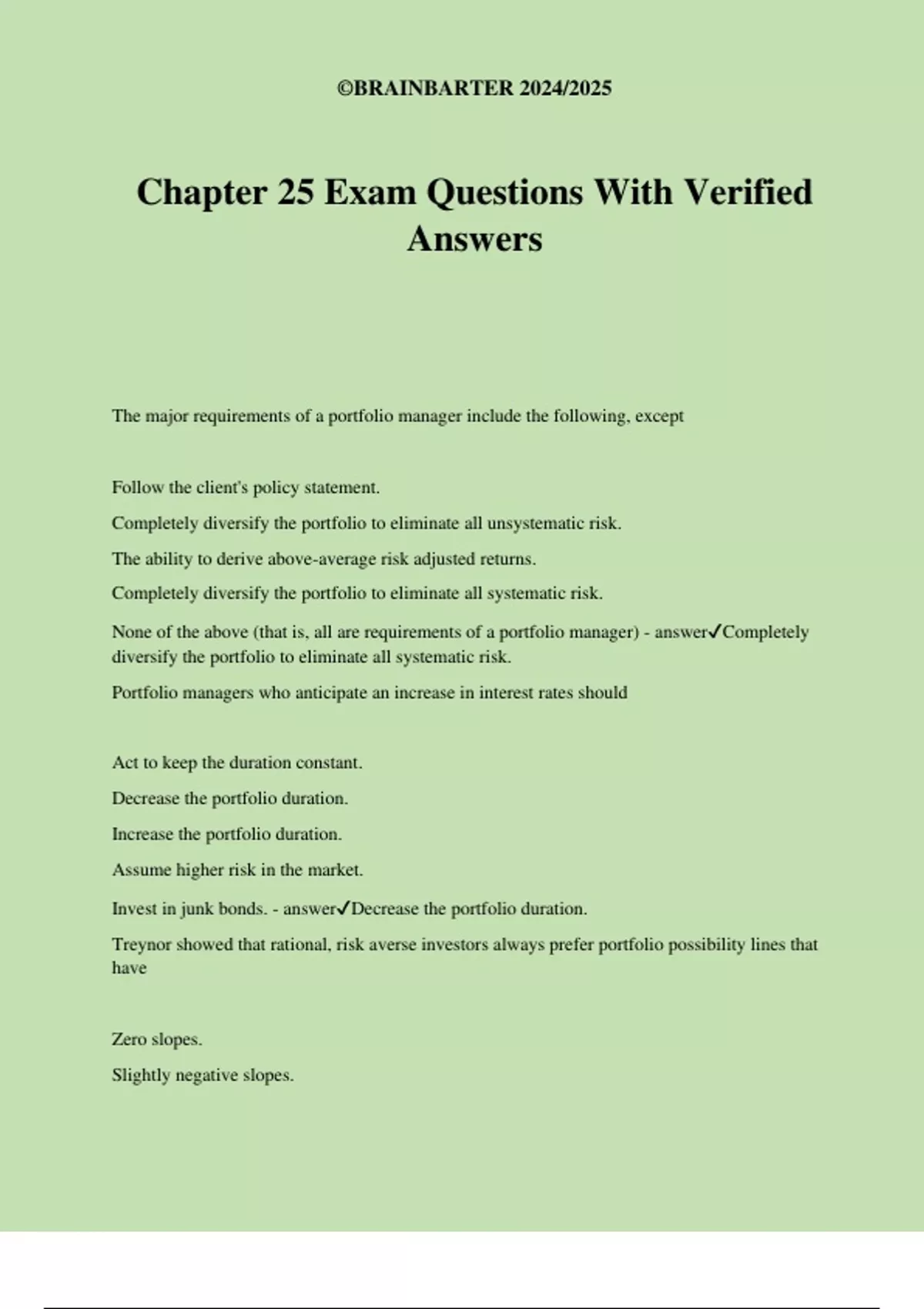 ©BRAINBARTER 2024/2025 Chapter 25 Exam Questions With Verified Answers The major requirements of a portfolio manager include the following, except Follow the client's policy statement. Completely diversify the portfolio to eliminate all unsystematic risk. The ability to derive above-average risk adjusted returns. Completely diversify the portfolio to eliminate all systematic risk. None of the above (that is, all are requirements of a portfolio manager) - answerCompletely diversify the portfolio to eliminate all systematic risk. Portfolio managers who anticipate an increase in interest rates should Act to keep the duration constant. Decrease the portfolio duration. Increase the portfolio duration. Assume higher risk in the market. Invest in junk bonds. - answerDecrease the portfolio duration. Treynor showed that rational, risk averse investors always prefer portfolio possibility lines that have Zero slopes. Slightly negative slopes. ©BRAINBARTER 2024/2025 Highly negative slopes. Slightly positive slopes. Highly positive slopes. - answerHighly positive slopes. The measure of performance which divides the portfolio's risk premium by the portfolio's beta is the Sharpe measure. Jensen measure. Fama measure. Alternative components model (MCV). Treynor measure. - answerTreynor measure. Sharpe's performance measure divides the portfolio's risk premium by the Standard deviation of the rate of return. Variance of the rate of return. Slope of the fund's characteristic line. Beta. Risk free rate. - answerStandard deviation of the rate of return. Which measure of portfolio performance allows analysts to determine the statistical significance of abnormal returns? Sharpe measure Jensen measure Fama measure Alternative components model (MCV) Treynor measure - answerJensen measure Selectivity measures how well a portfolio