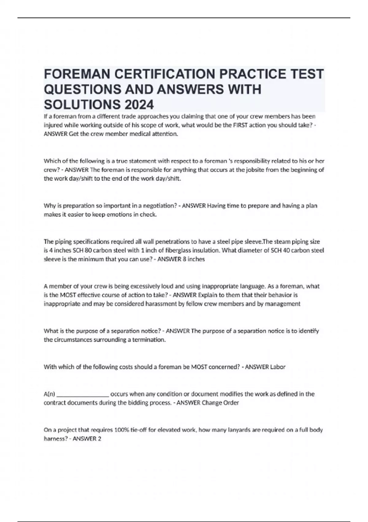 FOREMAN CERTIFICATION PRACTICE TEST QUESTIONS AND ANSWERS WITH SOLUTIONS 2024