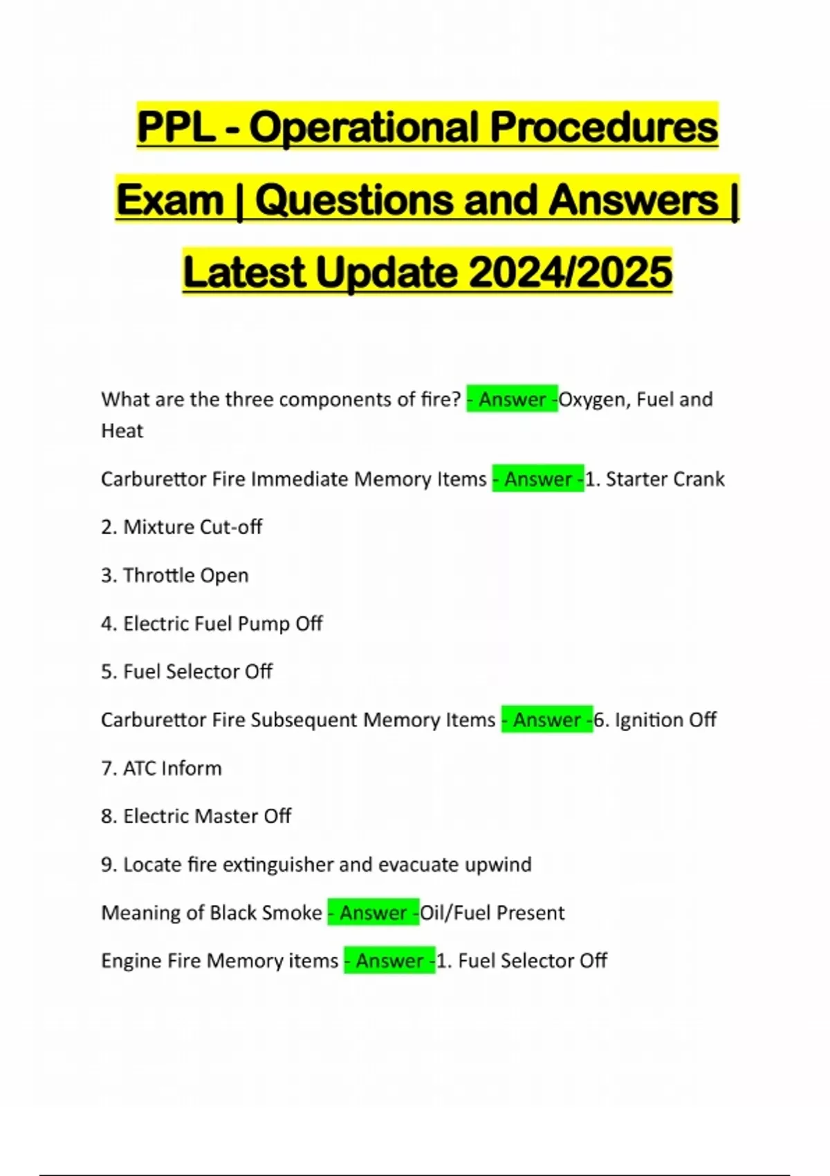 PPL - Operational Procedures Exam | Questions and Answers | Latest Update 2024/2025 What are the three components of fire? - Answer -Oxygen, Fuel and Heat Carburettor Fire Immediate Memory Items - Answer -1. Starter Crank 2. Mixture Cut-off 3. Throttle Open 4. Electric Fuel Pump Off 5. Fuel Selector Off Carburettor Fire Subsequent Memory Items - Answer -6. Ignition Off 7. ATC Inform 8. Electric Master Off 9. Locate fire extinguisher and evacuate upwind Meaning of Black Smoke - Answer -Oil