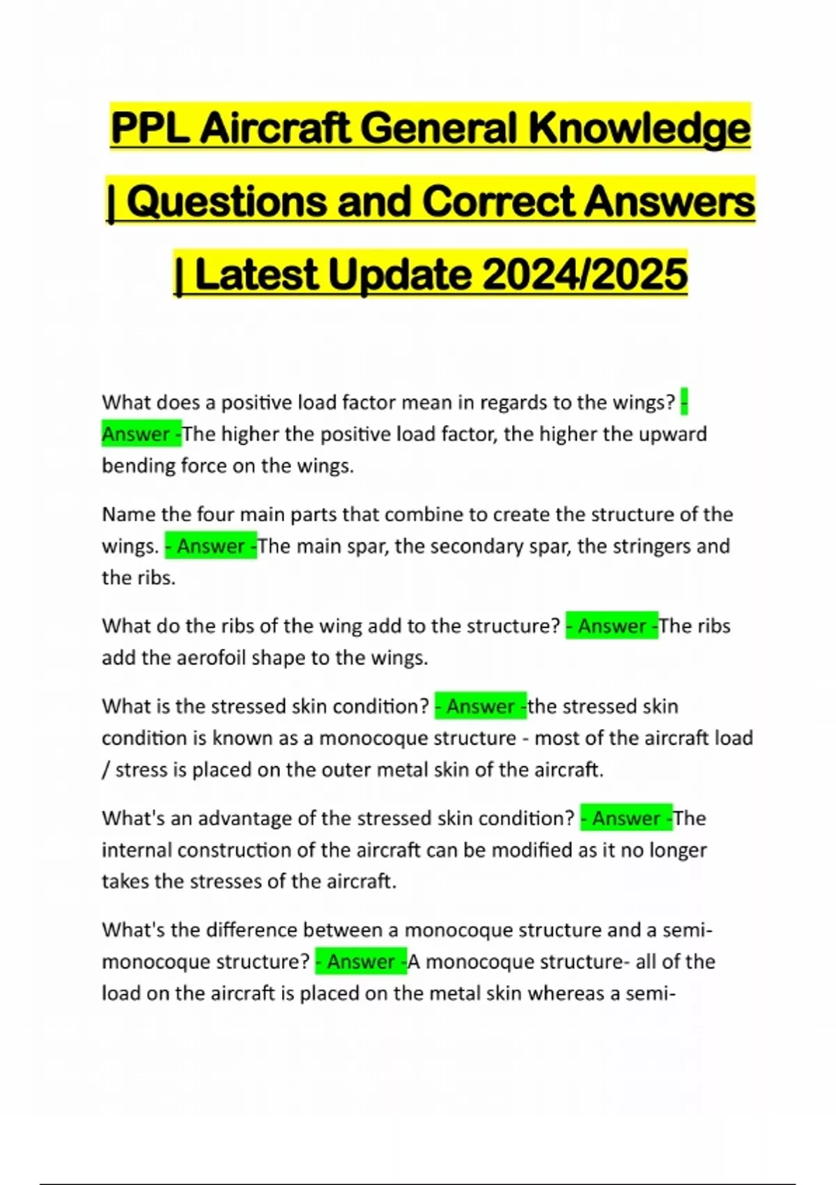 PPL Aircraft General Knowledge | Questions and Correct Answers | Latest Update 2024/2025 What does a positive load factor mean in regards to the wings? - Answer -The higher the positive load factor, the higher the upward bending force on the wings. Name the four main parts that combine to create the structure of the wings. - Answer -The main spar, the secondary spar, the stringers and the ribs. What do the ribs of the wing add to the structure? - Answer -The ribs add the aerofoil shape to the wings. What is the stressed skin condition? - Answer -the stressed skin condition is known as a monocoque structure - most of the aircraft load / stress is placed on the outer metal skin of the aircraft. What's an advantage of the stressed skin condition? - Answer -The internal construction of the aircraft can be modified as it no longer takes the stresses of the aircraft. What's the difference between a monocoque structure and a semimonocoque structure? - Answer -A monocoque structure- all of the load on the aircraft is placed on the metal skin whereas a semimonocoque structure, only some of the stress is put on the aircraft skin and most of it is placed on the internal structure. What's the equation for aspect ratio? - Answer -Aspect ratio = wings span/wing chord What is aspect ratio? - Answer -Aspect ra