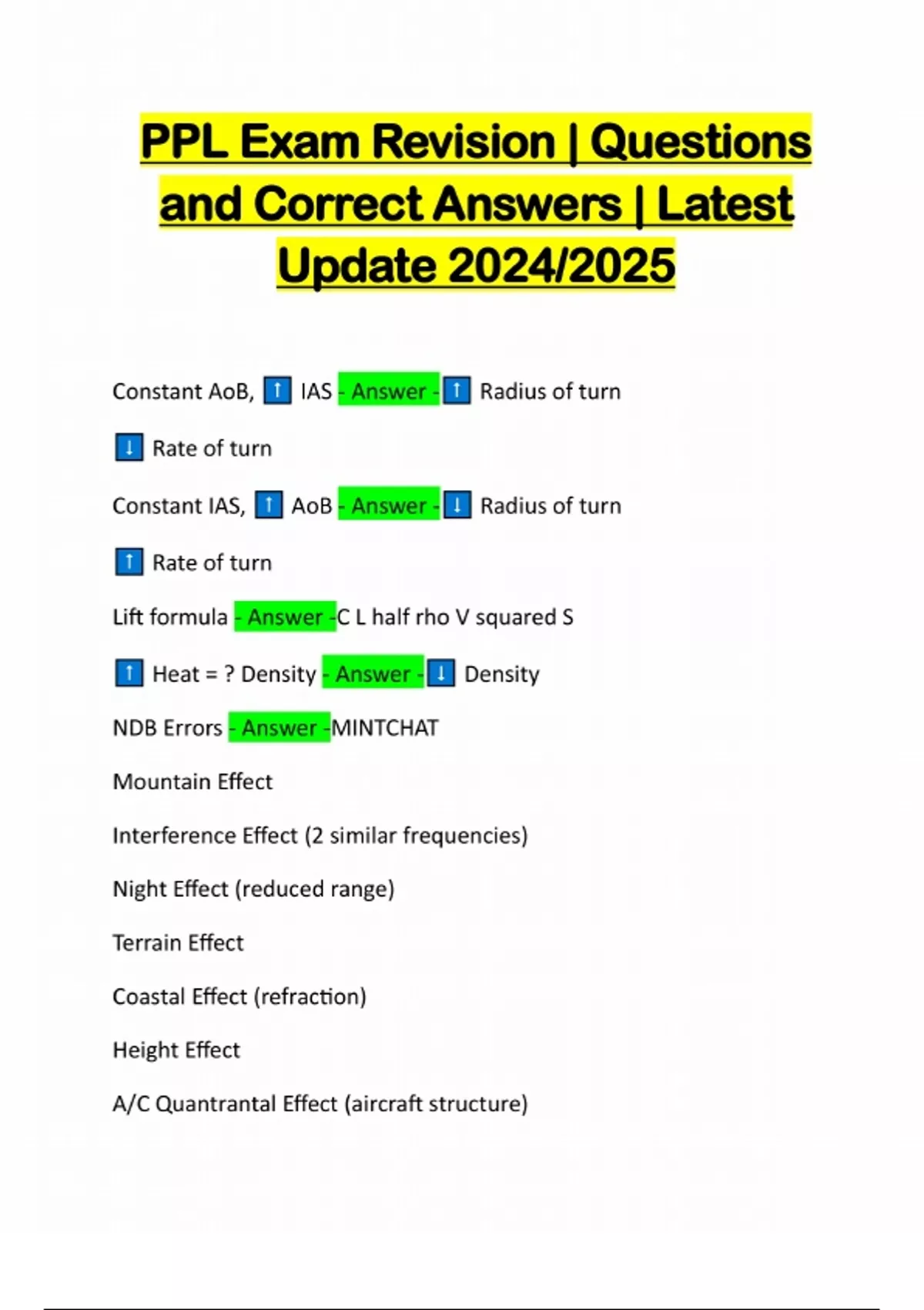 PPL Exam Revision | Questions and Correct Answers | Latest Update 2024/2025 Constant AoB, IAS - Answer - Radius of turn Rate of turn Constant IAS, AoB - Answer - Radius of turn Rate of turn Lift formula - Answer -C L half rho V squared S Heat = ? Density - Answer - Density NDB Errors - Answer -MINTCHAT Mountain Effect Interference Effect (2 similar frequencies) Night Effect (reduced range) Terrain Effect Coastal Effect (refraction) Height Effect A/C Quantrantal Effect (aircraft structure)Thunderstorm Effect (points to storms) VOR Errors - Answer -VTAAGS Vertical Polarisation (VOR transmits horizontal waves) Terrain Effect (scalloping is fast oscillations, bending is slow oscillations) Airborne Equipment Error Aggregate Error (combined error of all) Ground Station (errors)
