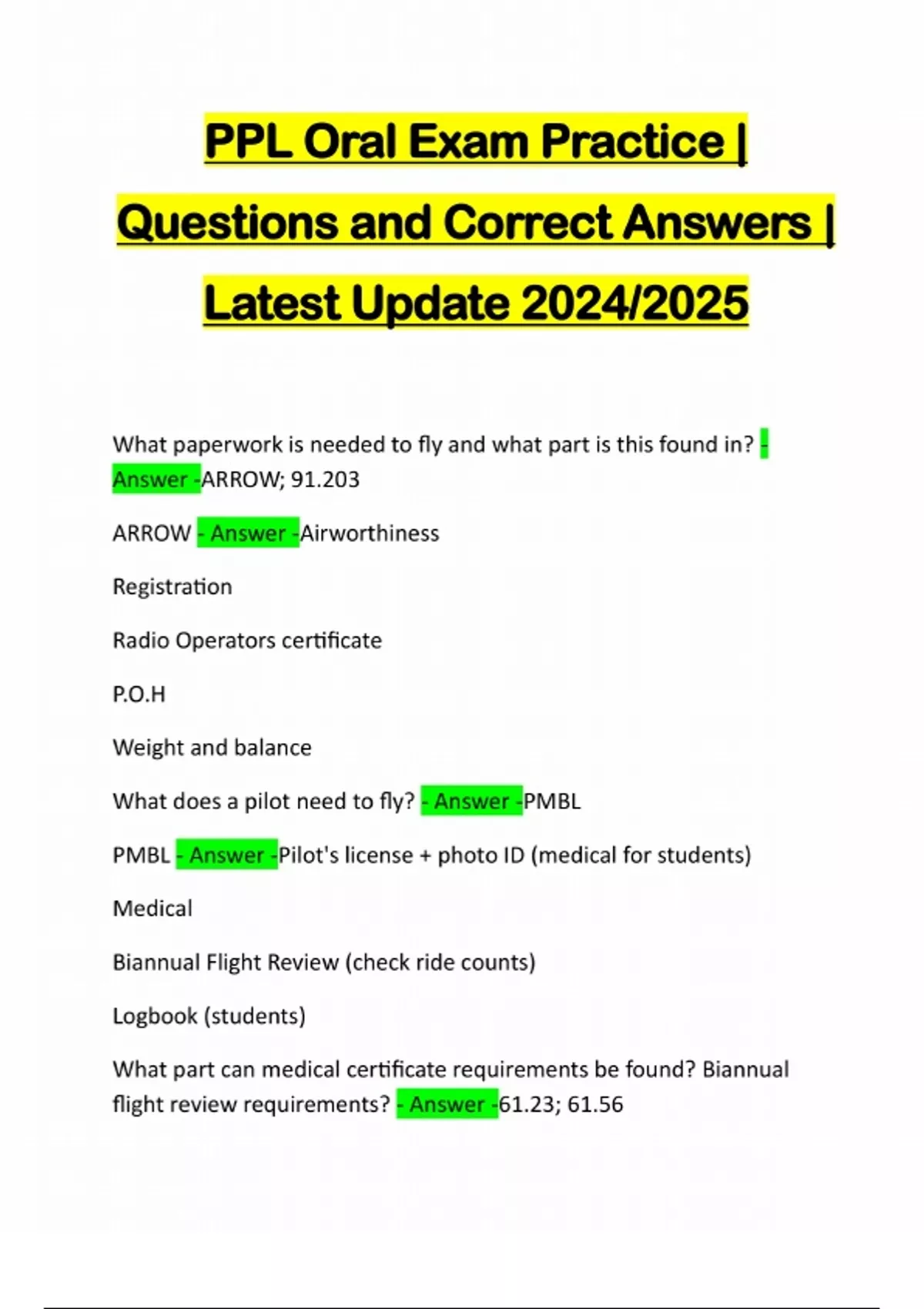 PPL Oral Exam Practice | Questions and Correct Answers | Latest Update 2024/2025 What paperwork is needed to fly and what part is this found in? - Answer -ARROW; 91.203 ARROW - Answer -Airworthiness Registration Radio Operators certificate P.O.H Weight and balance What does a pilot need to fly? - Answer -PMBL PMBL - Answer -Pilot's license + photo ID (medical for students) Medical Biannual Flight Review (check ride counts) Logbook (students) What part can medical certificate requirements be found? Biannual flight review requirements? - Answer -61.23; 61.56What equipment is required to fly for VFR in daytime? What part can they be found in? - Answer -TOMATOFLAMES; 91.205 TOMATOFLAMES - Answer -Temp. gauge (liquid cooled only) Oil temp. Gauge- air cooled Manifold pressure- constant speed prop only Altimeter/airspeed indicator Tachometer (RPM) Oil pressure
