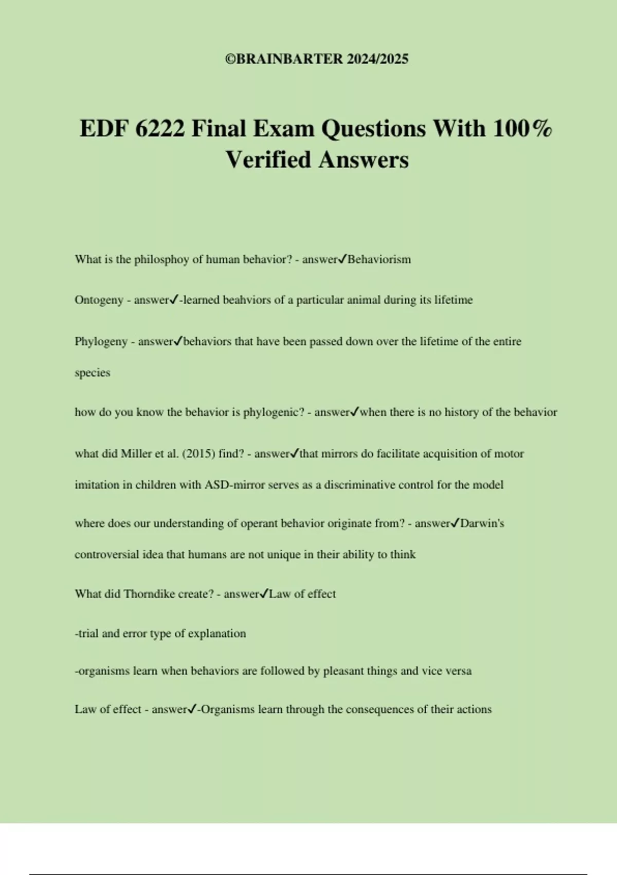 EDF 6222 Final Exam Questions With 100% Verified Answers What is the philosphoy of human behavior? - answerBehaviorism Ontogeny - answer-learned beahviors of a particular animal during its lifetime Phylogeny - answerbehaviors that have been passed down over the lifetime of the entire species how do you know the behavior is phylogenic? - answerwhen there is no history of the behavior what did Miller et al. (2015) find? - answerthat mirrors do facilitate acquisition of motor imitation in children with ASD-mirror serves as a discriminative control for the model where does our understanding of operant behavior originate from? - answerDarwin's controversial idea that humans are not unique in their ability to think What did Thorndike create? - answerLaw of effect -trial and error type of explanation -organisms learn when behaviors are followed by pleasant things and vice versa Law of effect - answer-Organisms learn through the consequences of their actions ©BRAINBARTER 2024/2025 -Bx decrease when followed by negative stimuli -Bx increase when followed by pleasant stimuli what is the most powerful stimulus in human learning? - answerconsequences/positive reinforcement rate of response - answerfrequency strongest behaviors are maintained by? - answerintermittent reinforcement why is "effective" reinforcer redundant - answer-the nature of a reinforcer is that it increases the behavior -"ineffective" reinforcers don't exist because a reinforcer is only a reinforcer if it increases a behavior what do verbal communities influence? - answerrepertoire of the speaker how do words develop meaning? - answerby the listener's responses to the word what is a referent - answer-every term must have an entity to which it corresponds -stimulus control over language which is more sensitive to program changes? frequency or precentage? - answerfrequency 10- 100x precision teaching - answermethod that adjusts the curricula for each learner to maximize learning based on their own celeration chart