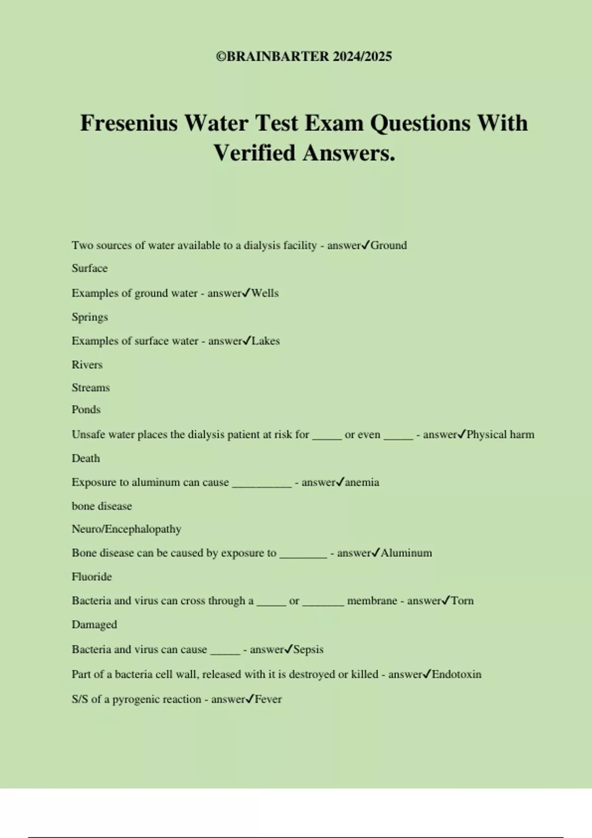 Fresenius Water Test Exam Questions With Verified Answers. Two sources of water available to a dialysis facility - answerGround Surface Examples of ground water - answerWells Springs Examples of surface water - answerLakes Rivers Streams Ponds Unsafe water places the dialysis patient at risk for _____ or even _____ - answerPhysical harm Death Exposure to aluminum can cause __________ - answeranemia bone disease Neuro/Encephalopathy Bone disease can be caused by exposure to ________ - answerAluminum Fluoride Bacteria and virus can cross through a _____ or _______ membrane - answerTorn Damaged Bacteria and virus can cause _____ - answerSepsis Part of a bacteria cell wall, released with it is destroyed or killed - answerEndotoxin S/S of a pyrogenic reaction - answerFever ©BRAINBARTER 2024/2025 Uncontrollable shakes Chills Hypotension N/V Organic contaminants that may be found in source water located close to golf course or farms - answerPesticides Herbicides Inorganic contaminants that may require the use of a multi-media filter - answerMud Silt Sand Bound chlorine is also ______ chlorine - answerCombined Free chlorine is ______ - answerUnbound _____ and _____ combine to make chloramine - answerChlorine Ammonia The acceptable range for Total Chlorine is ____-_____ - answer0.00-0.09 Total Chlorine testing is done initially _____ and then ______ - answerBefore 1st pt Tx every 4 hours Exposure to high levels of chlorine can lead to ______ - answerHemolysis Destruction of red blood cells - answerHemolysis S/S of hemolysis - answerChest pain SOB N/V In hemolysis, blood will be ______ - answertranslucent cherry pop colored City water entering the facility begins the _____ pathway - answerFluid The purpose of the backflow preventors is to ______ - answerprevent water flowing back into city water and contaminating local water supply