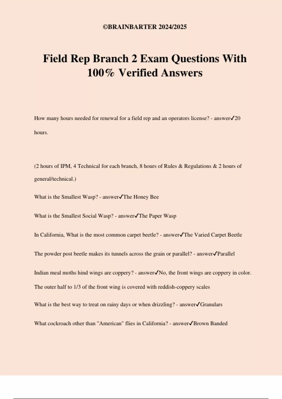 ©BRAINBARTER 2024/2025 Field Rep Branch 2 Exam Questions With 100% Verified Answers How many hours needed for renewal for a field rep and an operators license? - answer20 hours. (2 hours of IPM, 4 Technical for each branch, 8 hours of Rules & Regulations & 2 hours of general/technical.) What is the Smallest Wasp? - answerThe Honey Bee What is the Smallest Social Wasp? - answerThe Paper Wasp In California, What is the most common carpet beetle? - answerThe Varied Carpet Beetle The powder post beetle makes its tunnels across the grain or parallel? - answerParallel Indian meal moths hind wings are coppery? - answerNo, the front wings are coppery in color. The outer half to 1/3 of the front wing is covered with reddish-coppery scales What is the best way to treat on rainy days or when drizzling? - answerGranulars What cockroach other than "American" flies in California? - answerBrown Banded ©BRAINBARTER 2024/2025 Is it legal to carry pesticide in side tool boxes? - answerYes, however is it illegal to carry pesticide inside the cab of the truck Can carpenter ants be found in attic and eaves? - answerYes What is the smallest Solitary Wasp? - answerA Potters wasp Can American Roaches be found in hospitals? - answerYes Are zoo's treated like hospitals? - answerYes Is it legal to dump empty pesticide bottles behind grocery stores? - answerYes, if the label has been stripped and the top broken off cans, or bottles are triple rinsed, cut and crushed Who regulates pesticides in transportation? - answerDepartment of Transportation (DOT) Which California Ant has the biggest crater? - answerWestern Harvester Ant What is the fee imposed if an operator or field rep makes a late payment for their renewal of license? - answer8675:Says- shall be 50% of the few required for the renewal of the license applied for before the expiration date...,but not more than $100 If an ant walks across chemical, what type of poisoning is likely to occur? - answerStomach, as each ant is groomed after it enters the nest If an operator changes companies how long does he/she have to notify the board? - answer8571 states: if the licensed op