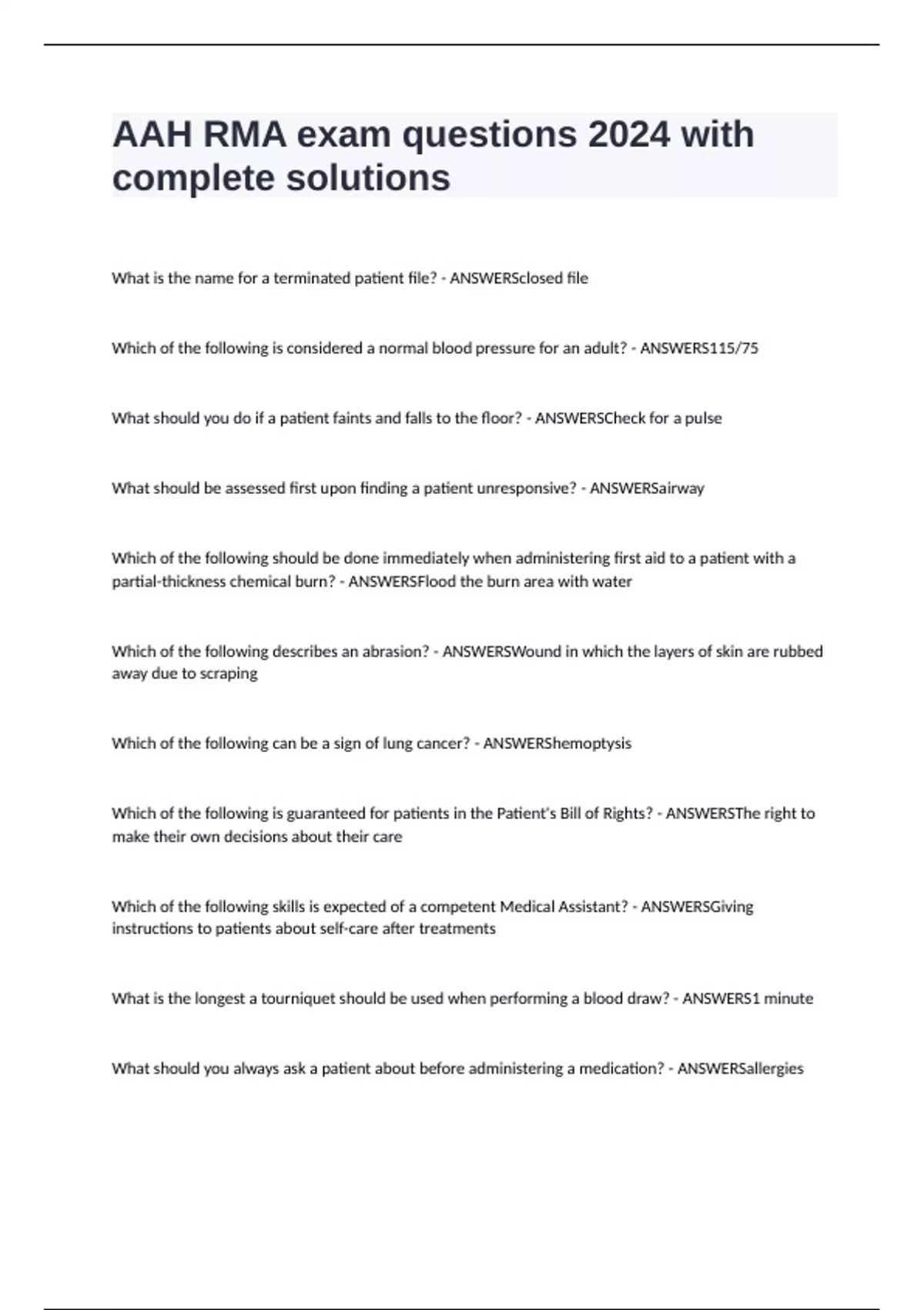 AAH RMA exam questions 2024 with complete solutions What is the name for a terminated patient file? - ANSWERSclosed file Which of the following is considered a normal blood pressure for an adult? - ANSWERS115/75 What should you do if a patient faints and falls to the floor? - ANSWERSCheck for a pulse What should be assessed first upon finding a patient unresponsive? - ANSWERSairway Which of the following should be done immediately when administering first aid to a patient with a partial-thickness chemical burn? - ANSWERSFlood the burn area with water Which of the following describes an abrasion? - ANSWERSWound in which the layers of skin are rubbed away due to scraping Which of the following can be a sign of lung cancer? - ANSWERShemoptysis Which of the following is guaranteed for patients in the Patient's Bill of Rights? - ANSWERSThe right to make their own decisions about their care Which of the following skills is expected of a competent Medical Assistant? - ANSWERSGiving instructions to patients about self-care after treatments What is the longest a tourniquet should be used when performing a blood draw? - ANSWERS1 minute What should you always ask a patient about before administering a medication? - ANSWERSallergies