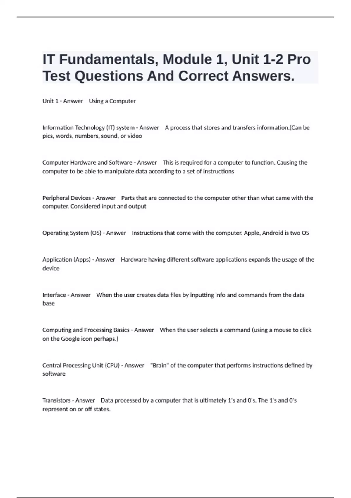 IT Fundamentals, Module 1, Unit 1-2 Pro Test Questions And Correct Answers.