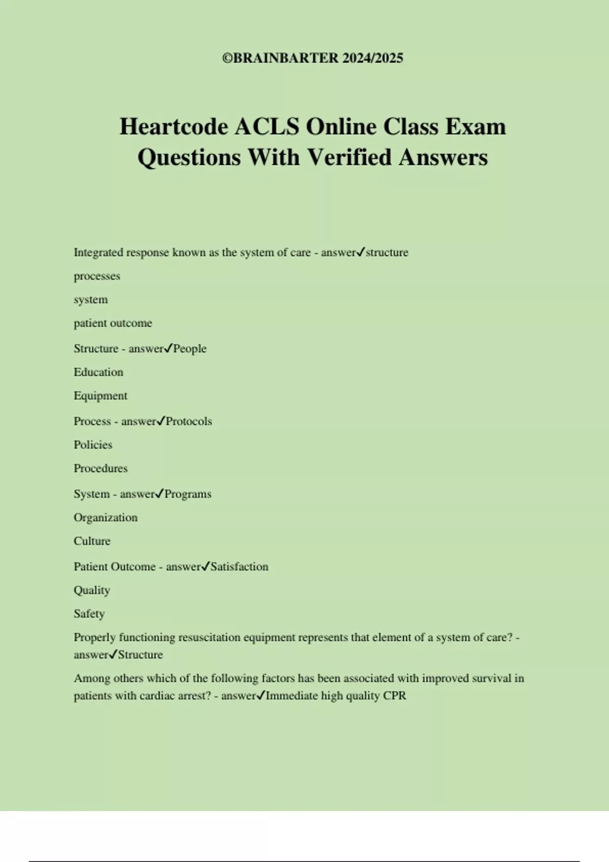 Heartcode ACLS Online Class Exam Questions With Verified Answers Integrated response known as the system of care - answerstructure processes system patient outcome Structure - answerPeople Education Equipment Process - answerProtocols Policies Procedures System - answerPrograms Organization Culture Patient Outcome - answerSatisfaction Quality Safety Properly functioning resuscitation equipment represents that element of a system of care? - answerStructure Among others which of the following factors has been associated with improved survival in patients with cardiac arrest? - answerImmediate high quality CPR ©BRAINBARTER 2024/2025 What is the first link in the out of hospital cardiac arrest (OHCA) Chain of Survival? - answerActivation of emergency response The purpose of a rapid response team (RRT) or medical emergency team (MET) is to - answerimprove patient outcomes by identifying and treating early clinical deterioration. Components of a rapid response system: - answerEvent detection and response triggering arm A plant response such an RRT or MET Quality monitoring Administrative support Criteria for RRT - answerAirway compromise Respiratory rate less than six per minute or more than 30 per minute Heart rate less than 40 per minute or greater than 140 per minute Systolic blood pressure less than 90 mm HG Symptomatic hypertension Unexpended decrease in level of consciousness Unexplained agitation Seizure Significant decrease in urine output Clinical deterioration that would prompt the activation of a rapid response system - answerSymptomatic hypertension Seizure Unexplained agitation IHCA - answerIn hospital cardiac arrest Benefits of implementing a rapid response system - answerDecreased in hospital cardiac arrest IHCA Decreased ICU length of stay Decrease in total hospital length of stay Whenever compressions are paused - answerCompressor should hover over the chest (not touching it) and be prepared for his integration