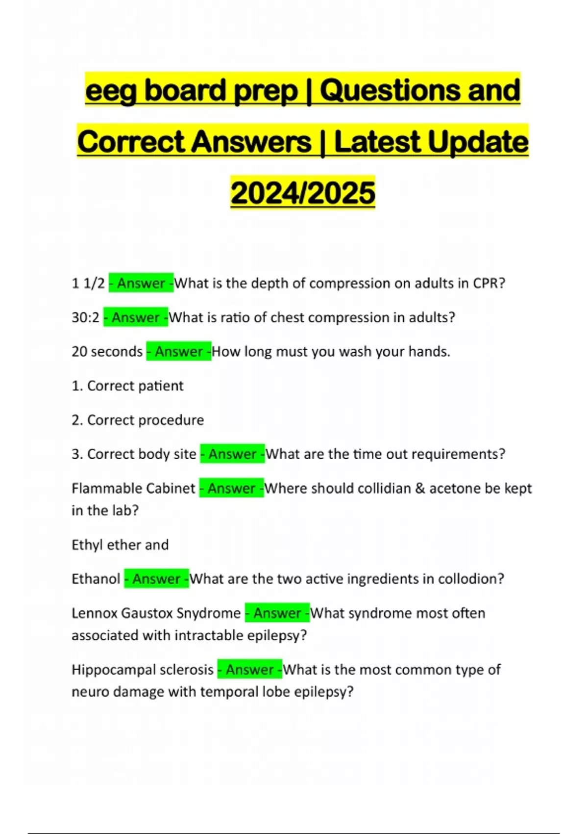 eeg board prep | Questions and Correct Answers | Latest Update 2024/2025 1 1/2 - Answer -What is the depth of compression on adults in CPR? 30:2 - Answer -What is ratio of chest compression in adults? 20 seconds - Answer -How long must you wash your hands. 1. Correct patient 2. Correct procedure 3. Correct body site - Answer -What are the time out requirements? Flammable Cabinet - Answer -Where should collidian & acetone be kept in the lab? Ethyl ether and Ethanol - Answer -What are the two active ingredients in collodion? Lennox Gaustox Snydrome - Answer -What syndrome most often associated with intractable epilepsy? Hippocampal sclerosis - Answer -What is the most common type of neuro damage with temporal lobe epilepsy?3tesla - Answer -What is the most common and sensitive MRI? Loss of volume of T1 - Answer -What does Hippocampal Sclerosis look like on MRI? Functional MRI - Answer -fMRI stands for? lateralize language & motor function - Answer -What is the role of the fMRI? Measures the levels of different metabolites in
