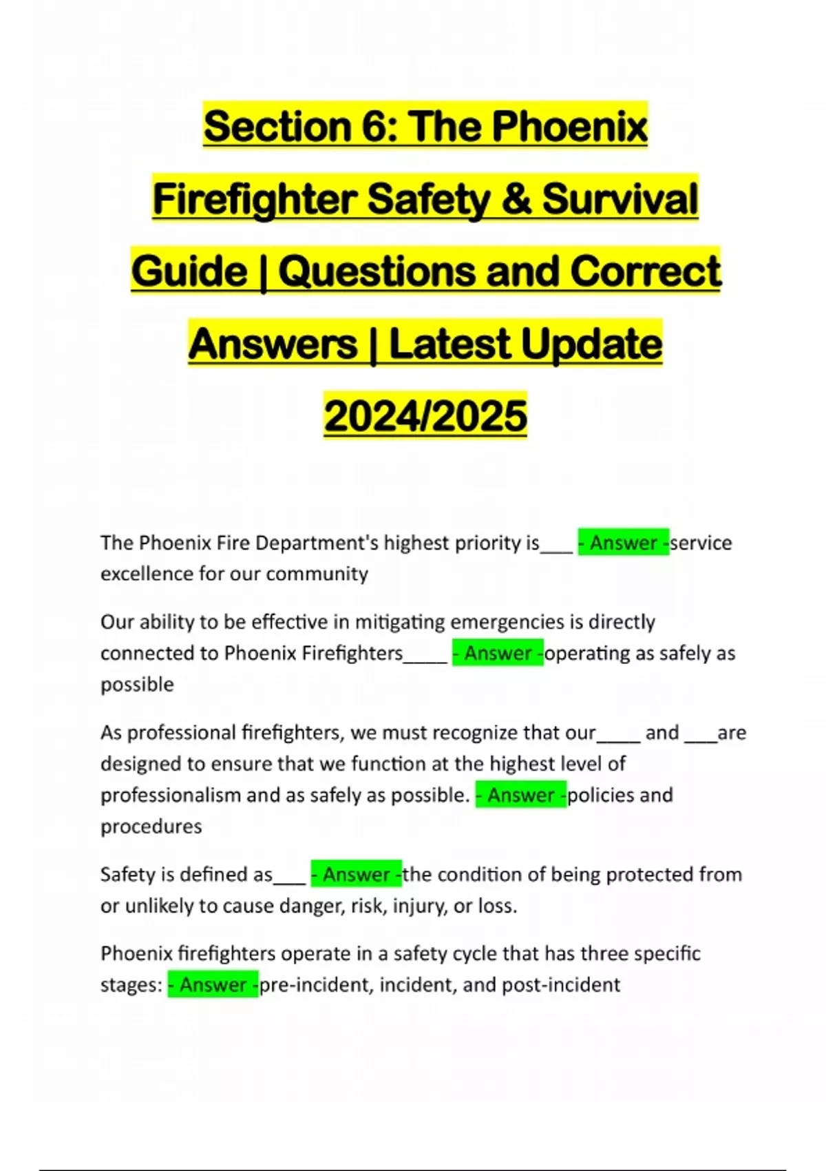Section 6: The Phoenix Firefighter Safety & Survival Guide | Questions and Correct Answers | Latest Update 2024/2025 The Phoenix Fire Department's highest priority is___ - Answer -service excellence for our community Our ability to be effective in mitigating emergencies is directly connected to Phoenix Firefighters____ - Answer -operating as safely as possible As professional firefighters, we must recognize that our____ and ___are designed to ensure that we function at the highest level of professionalism and as safely as possible. - Answer -policies and procedures Safety is defined as___ - Answer -the condition of being protected from or unlikely to cause danger, risk, injury, or loss. Phoenix firefighters operate in a safety cycle that has three specific stages: - Answer -pre-incident, incident, and post-incidentThese stages directly correspond with the__ - Answer -prevention, response, and recovery cycles of emrgency management. These elements are further supported by supervision, training, review, and most importantly from ____ of the Phoenix Fire Department and its members. - Answer -"buy-in" -Members will follow all safety policies and procedures -Members are not empowered to compromise safety policies and procedures -Supervisors will manage the safe and effective work