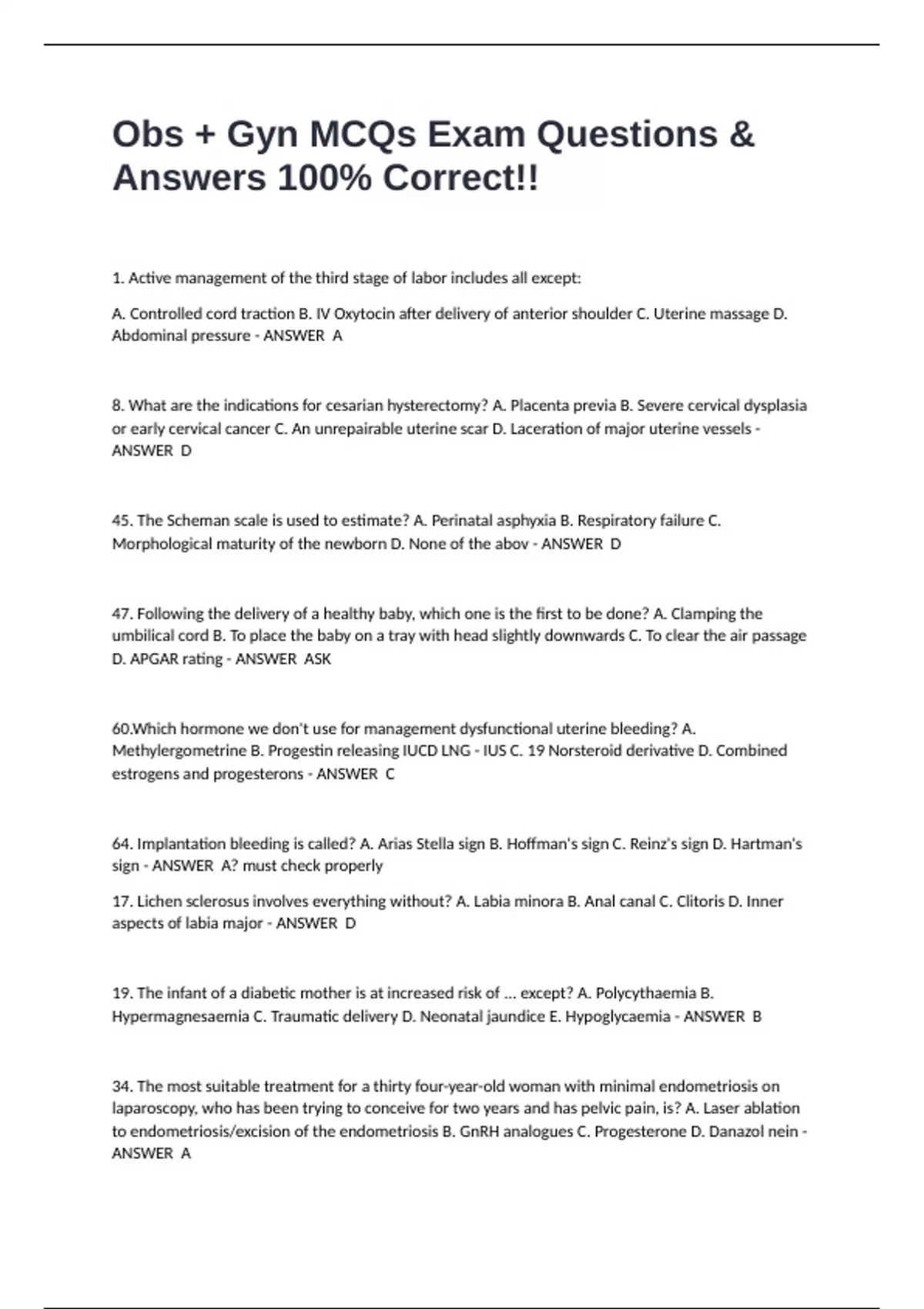 1. Active management of the third stage of labor includes all except: A. Controlled cord traction B. IV Oxytocin after delivery of anterior shoulder C. Uterine massage D. Abdominal pressure - ANSWER A 8. What are the indications for cesarian hysterectomy? A. Placenta previa B. Severe cervical dysplasia or early cervical cancer C. An unrepairable uterine scar D. Laceration of major uterine vessels - ANSWER D 45. The Scheman scale is used to estimate? A. Perinatal asphyxia B. Respiratory failure C. Morphological maturity of the newborn D. None of the abov - ANSWER D 47. Following the delivery of a healthy baby, which one is the first to be done? A. Clamping the umbilical cord B. To place the baby on a tray with head slightly downwards C. To clear the air passage D. APGAR rating - ANSWER ASK 60.Which hormone we don't use for management dysfunctional uterine bleeding? A. Methylergometrine B. Progestin releasing IUCD LNG - IUS C. 19 Norsteroid derivative D. Combined estrogens and progesterons - ANSWER C