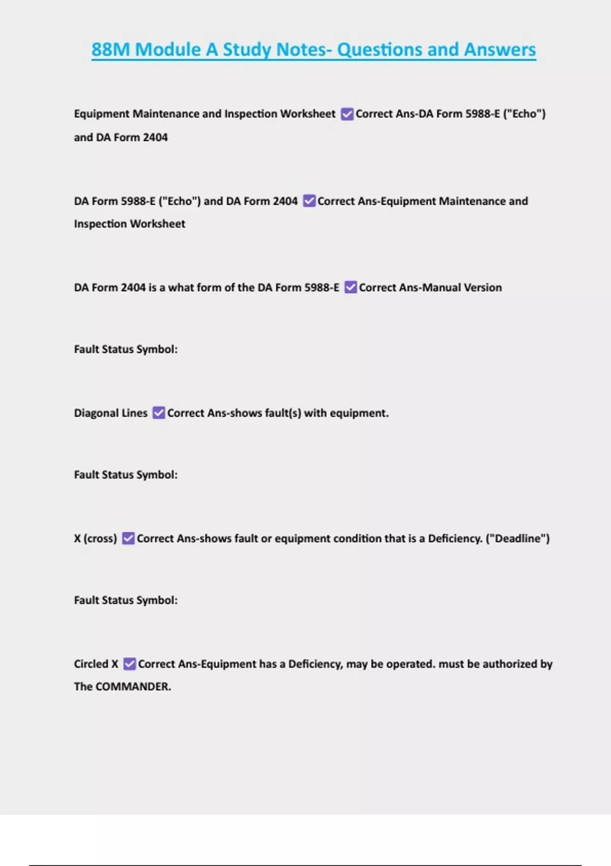 88M Module A Study Notes- Questions and Answers Equipment Maintenance and Inspection Worksheet Correct Ans-DA Form 5988-E ("Echo") and DA Form 2404 DA Form 5988-E ("Echo") and DA Form 2404 Correct Ans-Equipment Maintenance and Inspection Worksheet
