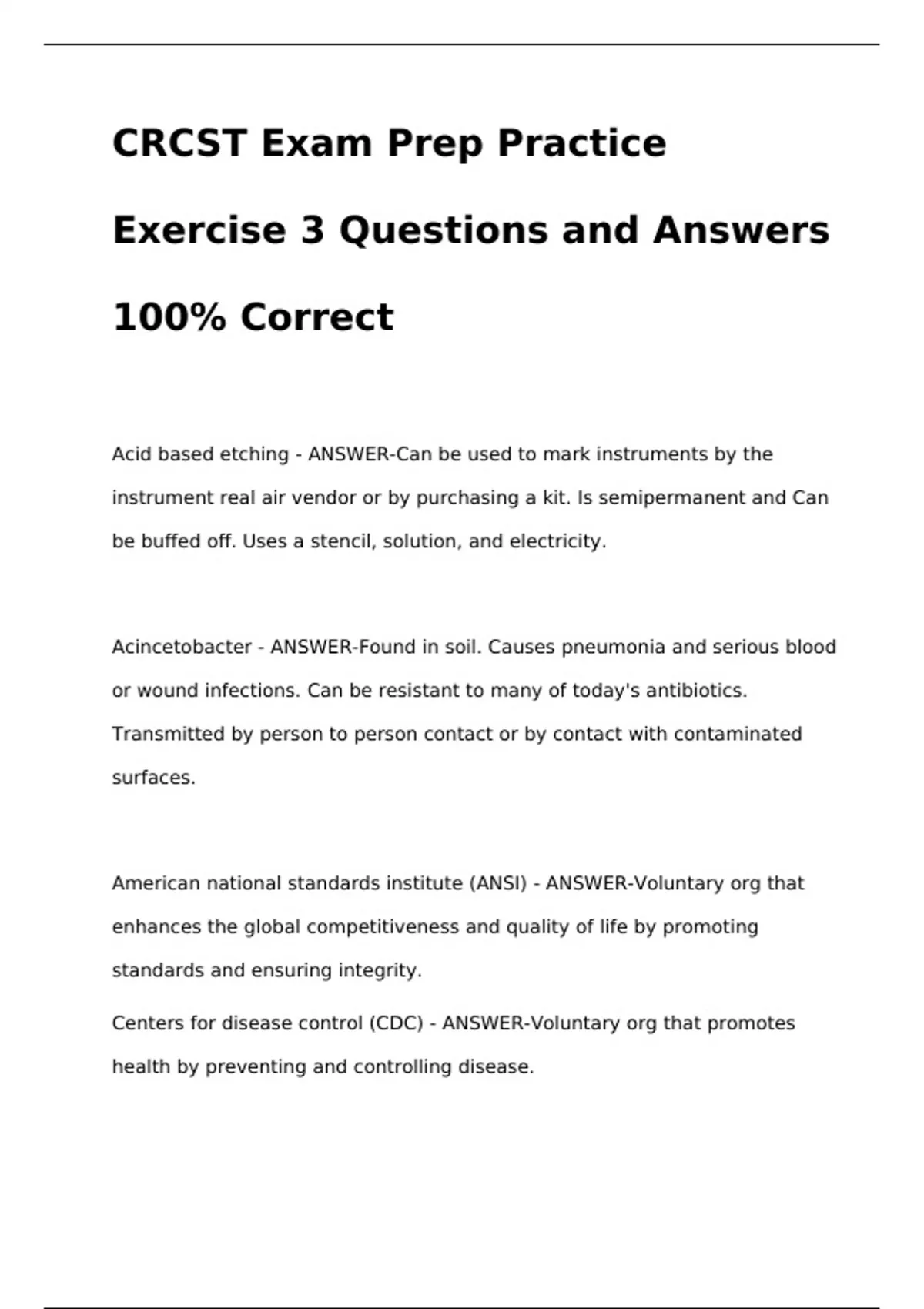 CRCST Exam Prep Practice Exercise 3 Questions and Answers 100% CorrectCRCST Exam Prep Practice Exercise 3 Questions and Answers 100% CorrectCRCST Exam Prep Practice Exercise 3 Questions and Answers 100% CorrectCRCST Exam Prep Practice Exercise 3 Questions and Answers 100% Correct Acid based etching - ANSWER-Can be used to mark instruments by the instrument real air vendor or by purchasing a kit. Is semipermanent and Can be buffed off. Uses a stencil, solution, and electricity. Acincetobacter - ANSWER-Found in soil. Causes pneumonia and serious blood or wound infections. Can be resistant to many of today's antibiotics. Transmitted by person to person contact or by contact with contaminated surfaces.