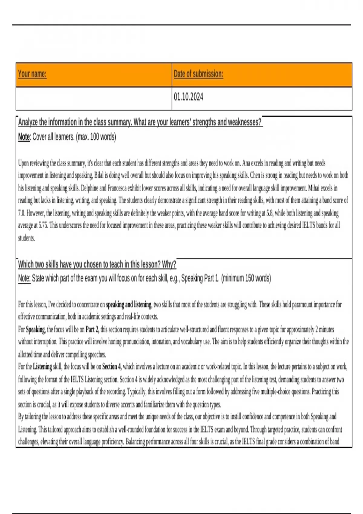 Note: State which part of the exam you will focus on for each skill, e.g., Speaking Part 1. (minimum 150 words)