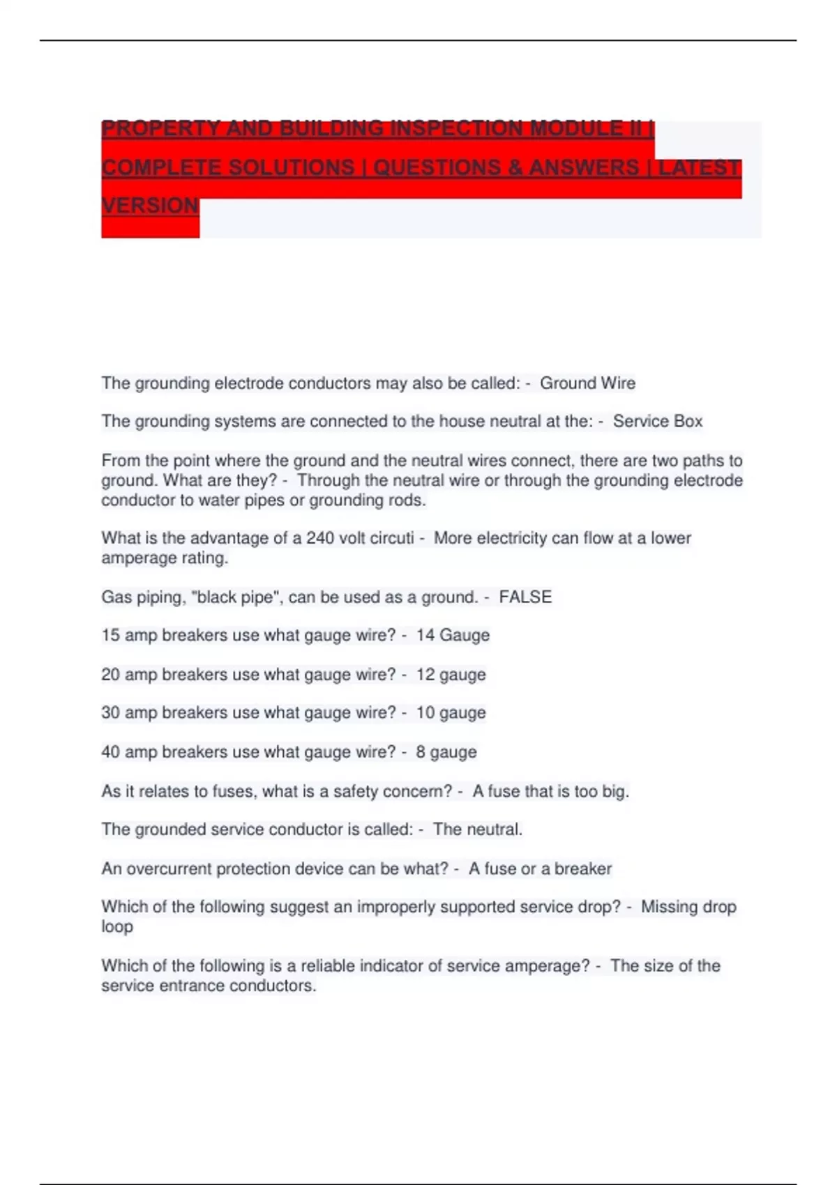 PROPERTY AND BUILDING INSPECTION MODULE II | COMPLETE SOLUTIONS | QUESTIONS & ANSWERS | LATEST VERSION The grounding electrode conductors may also be called: - Ground Wire The grounding systems are connected to the house neutral at the: - Service Box From the point where the ground and the neutral wires connect, there are two paths to ground. What are they? - Through the neutral wire or through the grounding electrode conductor to water pipes or grounding rods. What is the advantage of a 240 volt circuti - More electricity can flow at a lower amperage rating. Gas piping, "black pipe", can be used as a ground. - FALSE 15 amp breakers use what gauge wire? - 14 Gauge 20 amp breakers use what gauge wire? - 12 gauge 30 amp breakers use what gauge wire? - 10 gauge 40 amp breakers use what gauge wire? - 8 gauge As it relates to fuses, what is a safety concern? - A fuse that is too big. The grounded service conductor is called: - The neutral. An overcurrent protection device can be what? - A fuse or a breaker Which of the following suggest an improperly supported service drop? - Missing drop loop Which of the following is a reliable indicator of service amperage? - The size of the service entrance conductors. Report as deficient breaker boxes that are? - Installed in hazardous location/safety issues What is the definition of a volt? - A volt is a measurement of the force or potential energy in an electrical system (V=IxR) What is the definition of an ohm? - An ohm is a measure of resistance to electrical flow in a conductor or insulator (R=V/I) What is a brief definition of an amp? - An amp is a measure of how much electrical current is flowing (I=V/R) What is a brief definition of watt? - A watt is a measure of the rate of electrical energy being consumed or released (P=VxI) In most areas, for what distance can service entrance wires run inside the building before going into the service box without special permission? - 0 feet or as short as possible. Service laterals are installed where? - Underground What is a common problem with service drops? - Proper clearance from roofs. What are two common problems with service entrance conductors? - No drip loop and no mast head. What are 3 common areas of water penetration? - Conduit joists, mast head, roof flashing. Implications of an undersized service include: - nuisance tripping of the main fuses or breakers. After entering the service box, the neutral service entrance conductor should - connect to the terminal with the grounding electrode and the service neutral. Double tapping is - the term for attaching two wires to a single fuse or breaker terminal Which of the following is a safety issue? - The main fuses have a higher rating than the service entrance wire. A 14-guage copper wire is protected by a 20amp fuse. You should report that - this is a defect, and recommend improvement. What is a suitable location for a branch circuit wire? - Stapled to two by four studs. Problems with aluminum wiring include all of the following except? -