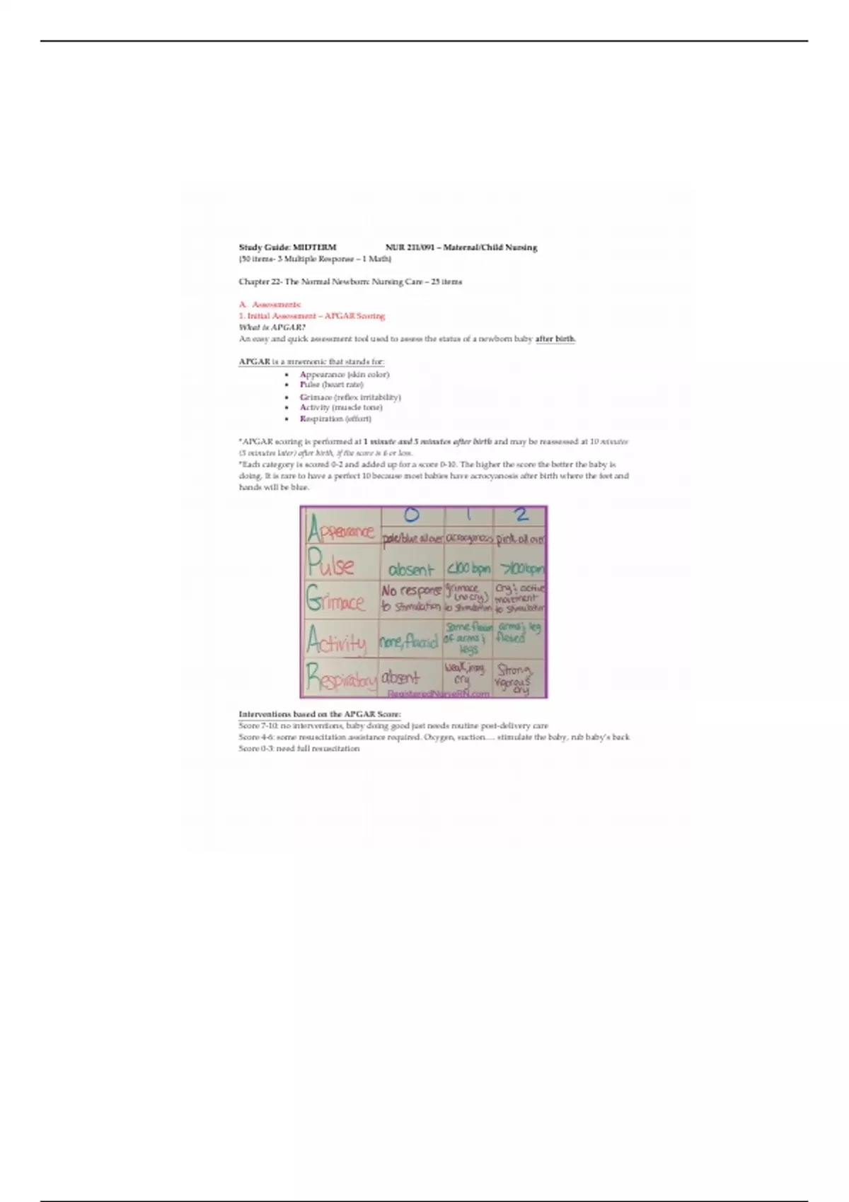 Interventions based on the APGAR Score: